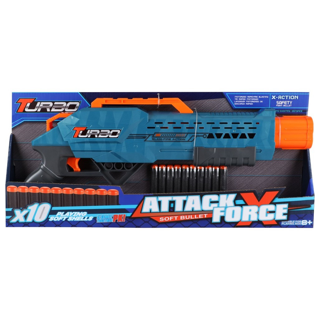 Blaster Turbo s dostřelem 10–15m. Balení obsahuje pistoli a 10ks nábojů. Náboj je z měkkého materiálu a s kulatou hlavou pro bezpečné střílení. Náboj je vyroben z pěnového materiálu a lze je recyklovat. Dlouhá vzdálenost dostřelu.