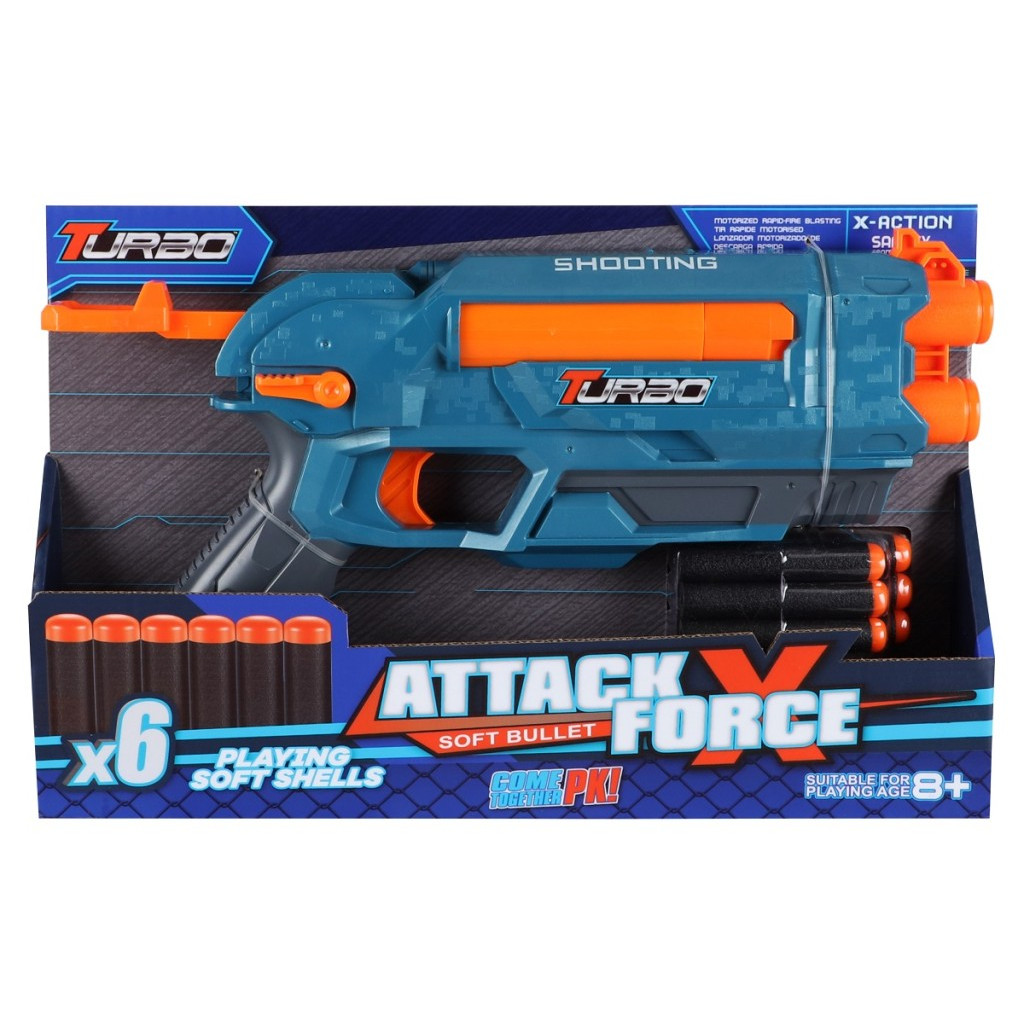 Blaster Turbo s dostřelem 8–15m. Balení obsahuje pistoli a 6 ks nábojů. Náboj je z měkkého materiálu a s kulatou hlavou pro bezpečné střílení. Náboj je vyroben z pěnového materiálu a lze je recyklovat.