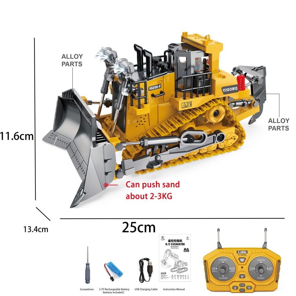 RC Buldozer 1:24 se pohybuje doleva, doprava, dopředu a dozadu, kola jako u buldozeru. Přední světla svítí. Maximální rychlost 10km/h. Frekvence 2,4G, maximální radiofrekvenční výkon 1mW, dosah dálkového ovládání 30 m.