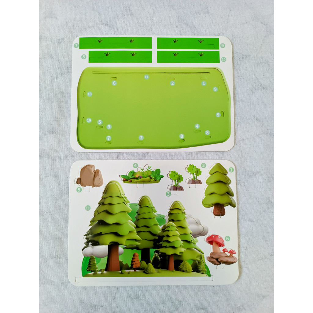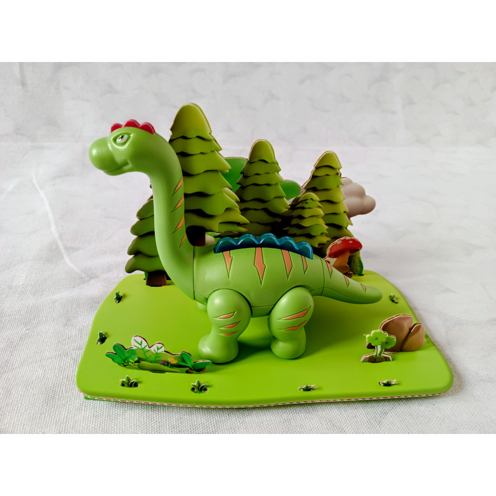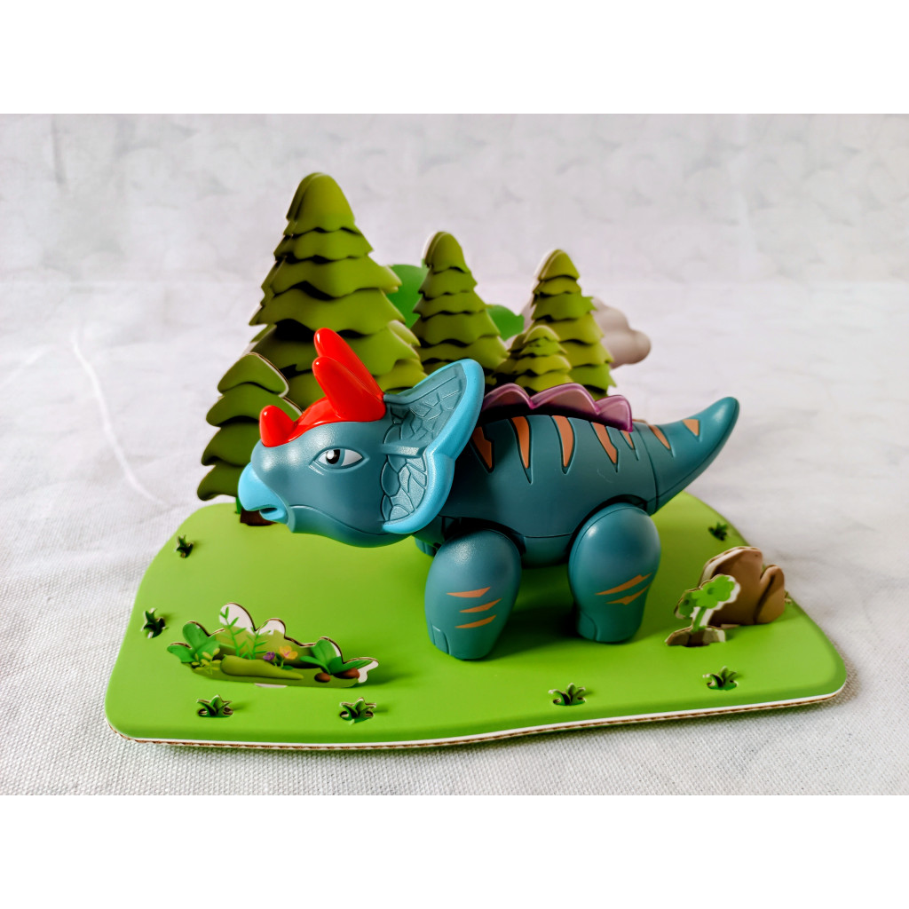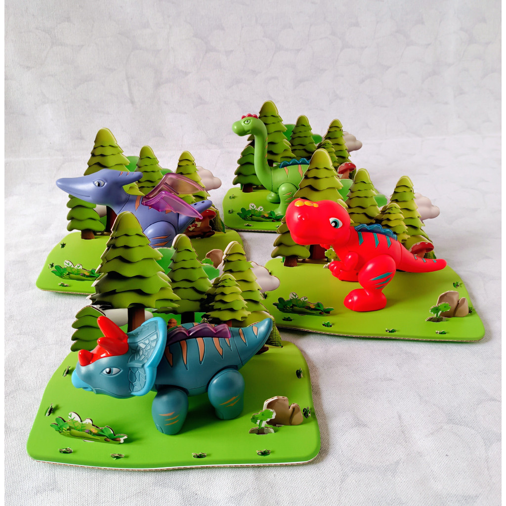 Set obsahuje 4 magnetické dinosaury (Tyrannosaur, Pterosaur, Triceratops, Brachiosaurus), doplňky pro sestavení scény krajiny (4 x krajina s lesem).