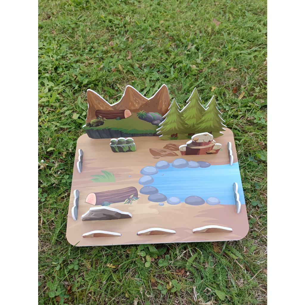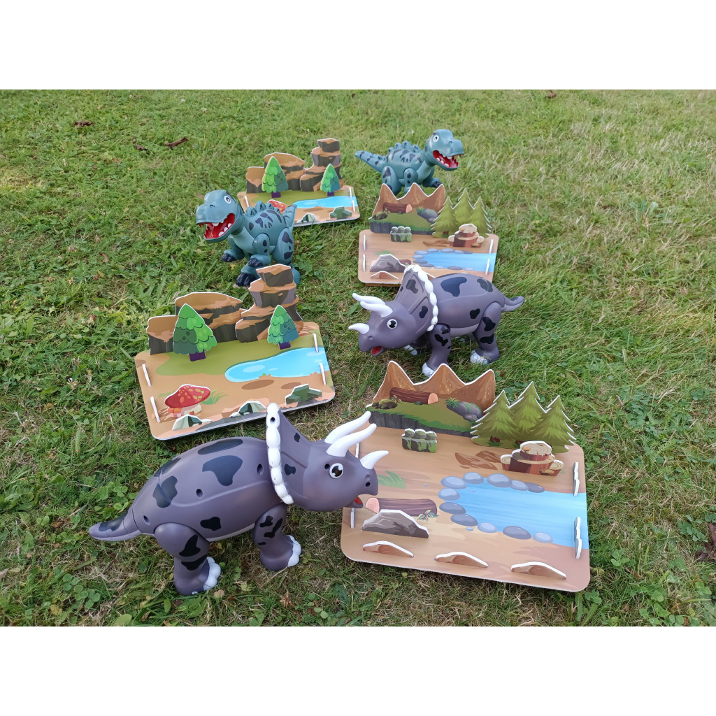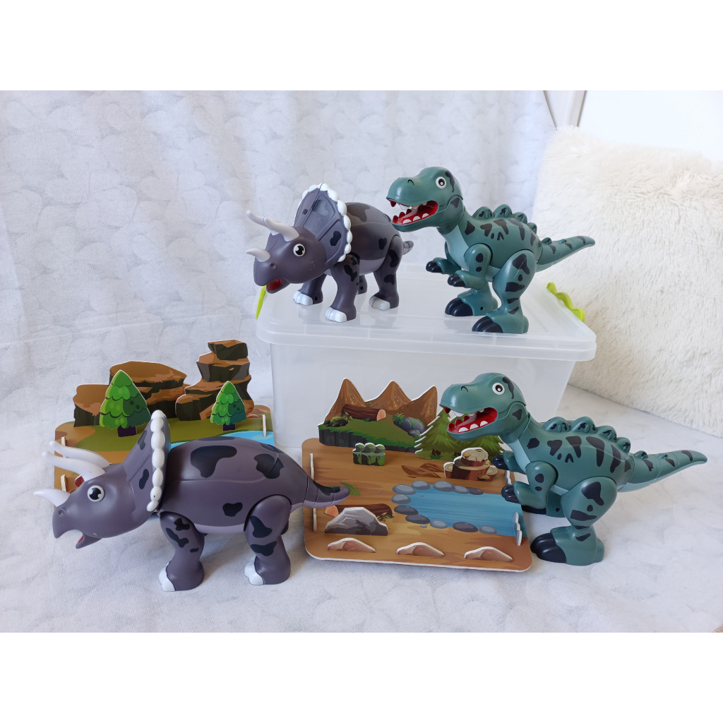 Set obsahuje: 4 velké magnetické dinosaury (2x Triceratops, 2x Tyrannosaurus rex), doplňky pro sestavení scény krajiny (2x krajina se skálami, 2x krajina s lesem/horami)