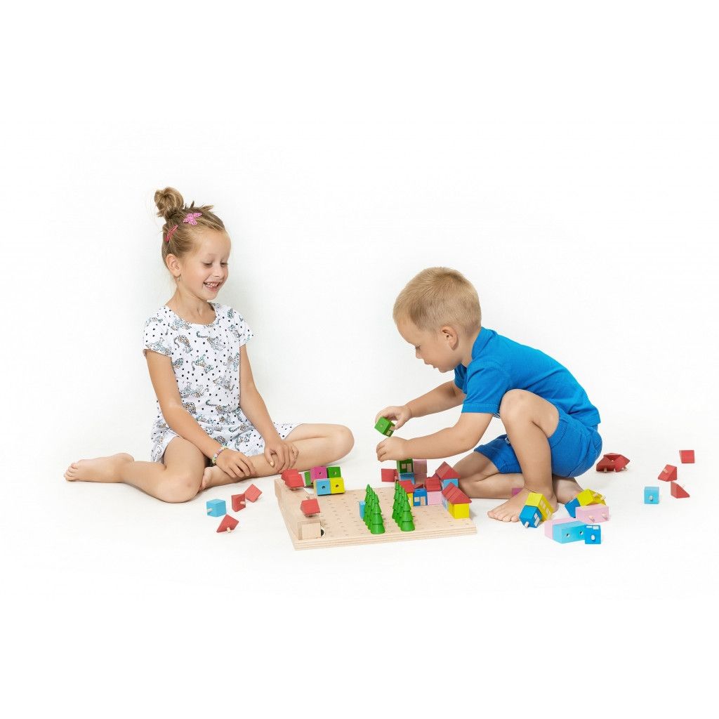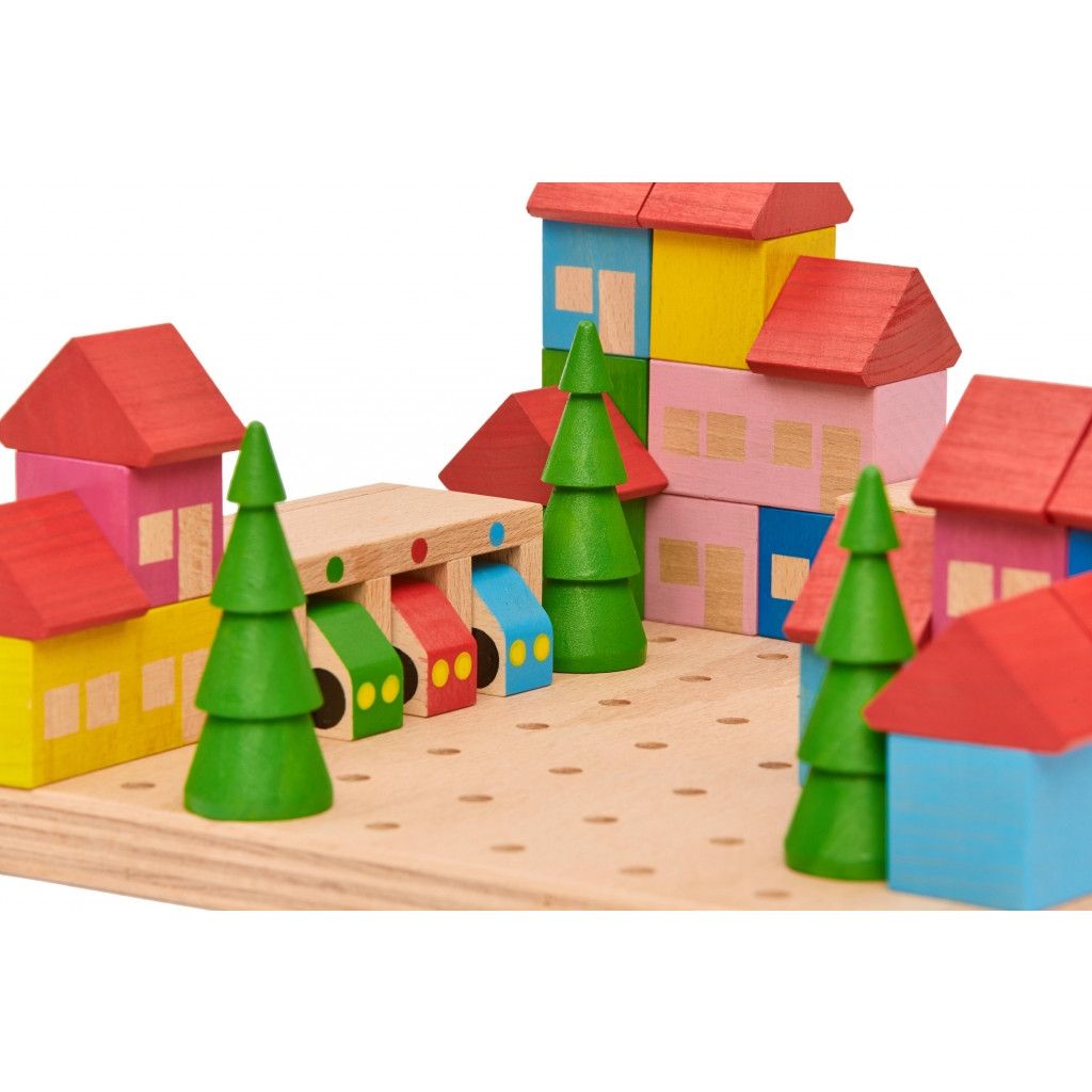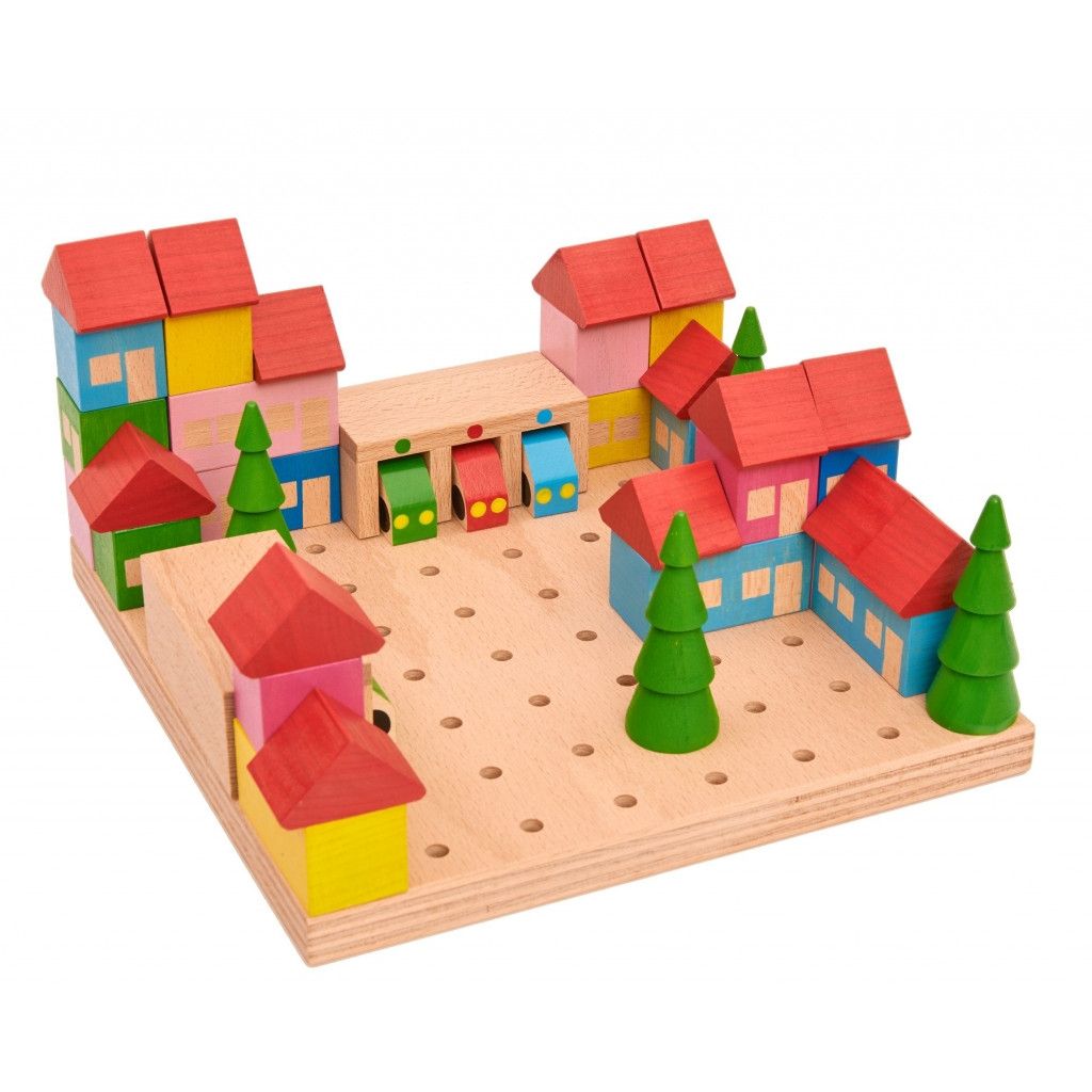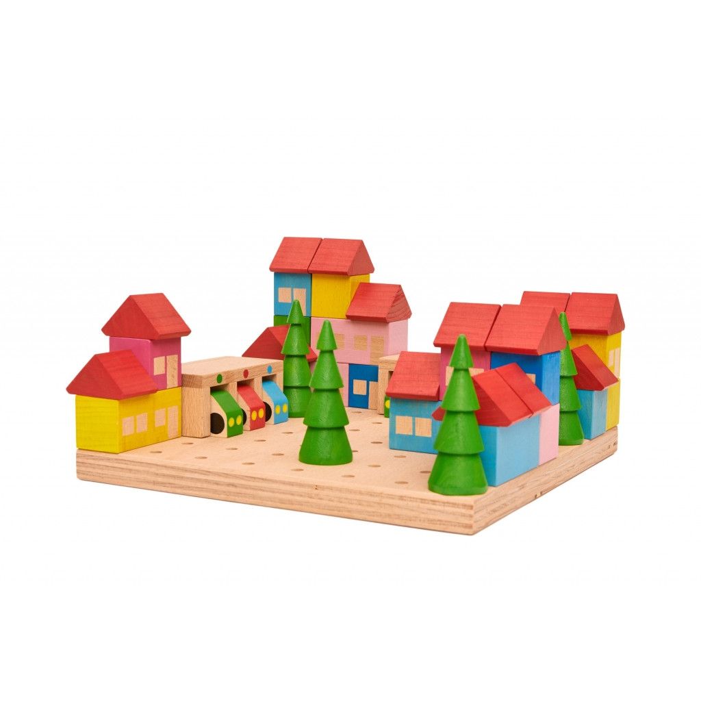 Když se poskládají jednoduché tvary Stavebnice městečko a umístí na to správné místo, vyrostou z nich pěkné domečky s červenými střechami. Autíčka mohou mít své garáže a před domy můžou vyrůst zelezné stromy a udělat příjemnou kulisu. Pro stabilitu celého městečka slouží zasouvání jednotlivých dílků do sebe a zároveň do podložky. Děti mohou kdykoliv domečky přestavět, přesunou s autíčky zaparkovat do do jejich garáží.