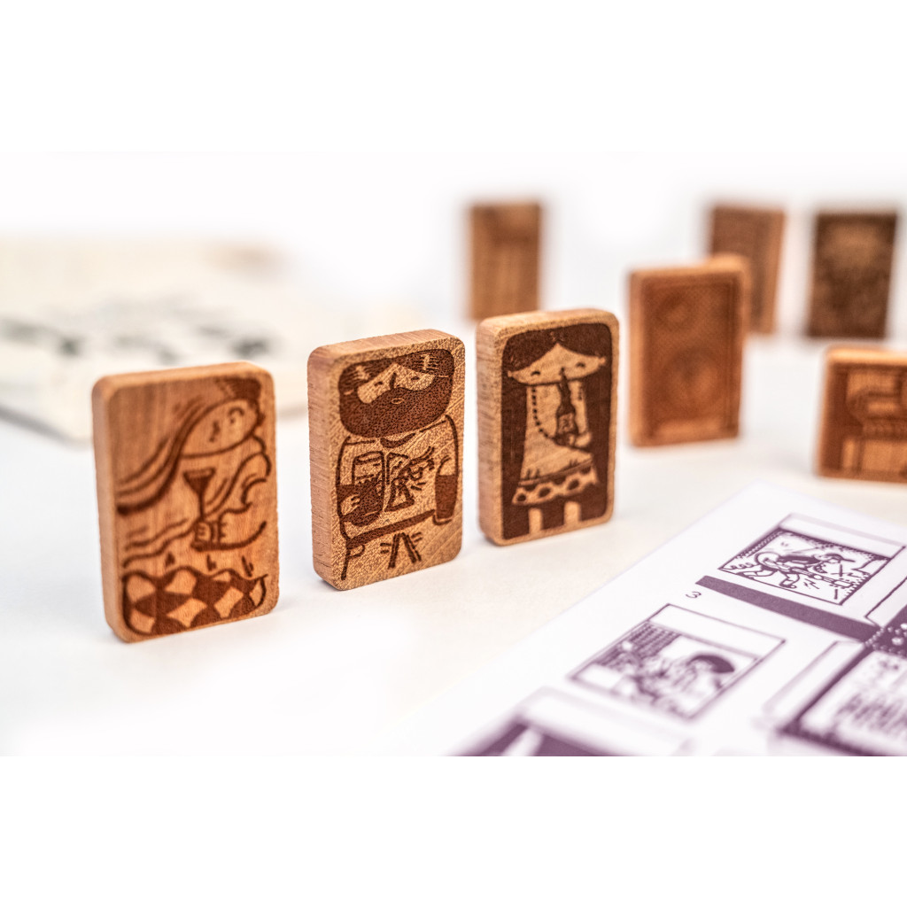 Materiál: kostky jsou vyrobeny z tropického dřeva Jatoby, obrázky gravírované, vystřihovánka s miniknížkou z papíru, pytlík ze 100% bavlny