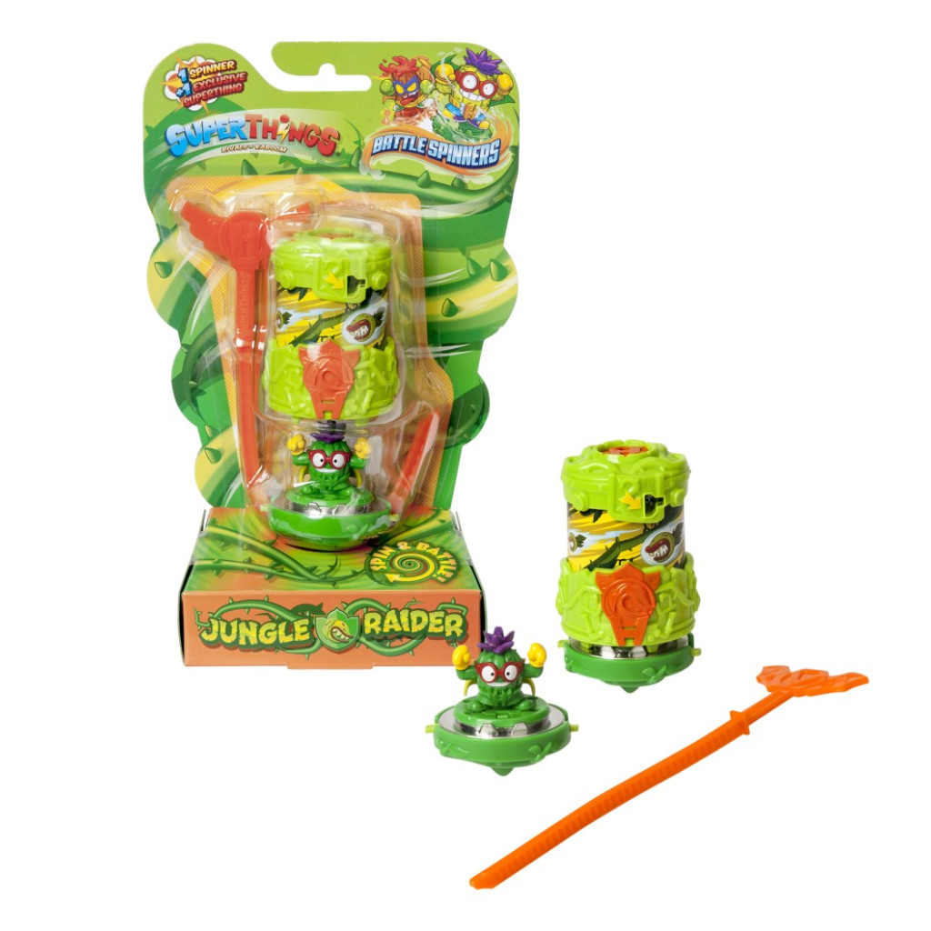 Figurka SuperThings S – Battle Spinners – spinery jsou připraveny k boji. Uveďte je do pohybu směrem k zemi a nechte je točit bez zastavení.Podívejte se, která z figurek se bude točit nejdéle a vyhrajte tuto bitvu. K dispozici jsou 4 modely Battle Spinnerů (ve 2 barvách), z nichž každý obsahuje exkluzivní figurku SuperThing: Frozen Flash přichází s figurkou jménem Ice Cool, Jungle Raider s Cactubular, Volcano Viper s Big Lava a Electric Storm s Power Batt.