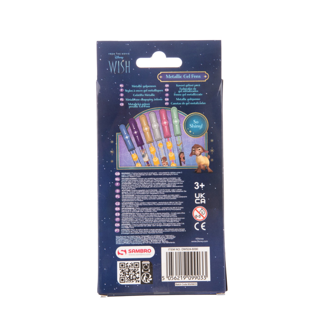 Gelová metalická pera v licenci Disney Wish. Balení obsahuje 6 ks gelových metalických per s různými motivy Disney – růžová, zlatá, stříbrná, fialová, modrá a zelená.
