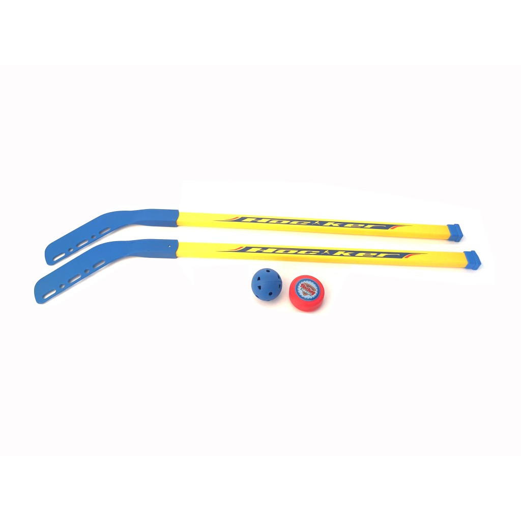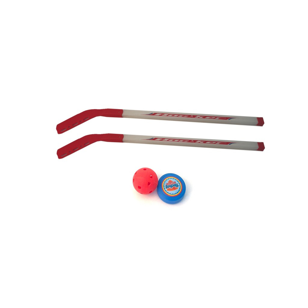 Set obsahuje plastovou hokejku, plastový míček a puk.