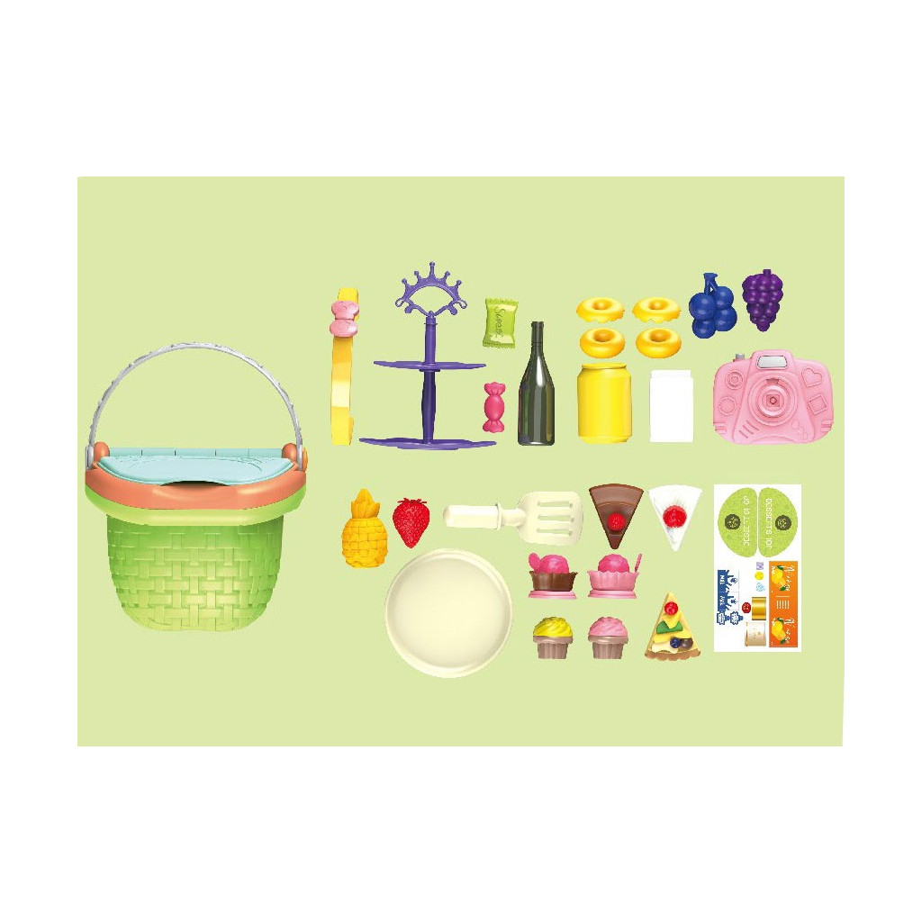 Piknikový košík plný dobrot. Košík obsahuje 27 kusů doplňků jako je např. ovoce, dezerty, láhev, talířek.