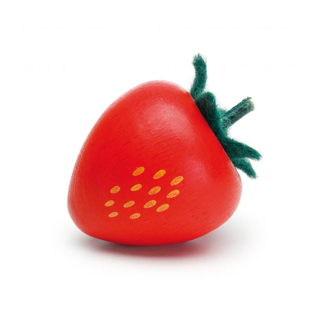 Jahoda ze dřeva. Rozměry (d x š x v) cm / hmotnost: 2,8 x 2,8 x 4,3 / 10 g. Určeno pro věk: 3+.Dřevěné ovoce, zelenina, potraviny a drogerie na hraní, jako výbava do dětské prodejny a ku