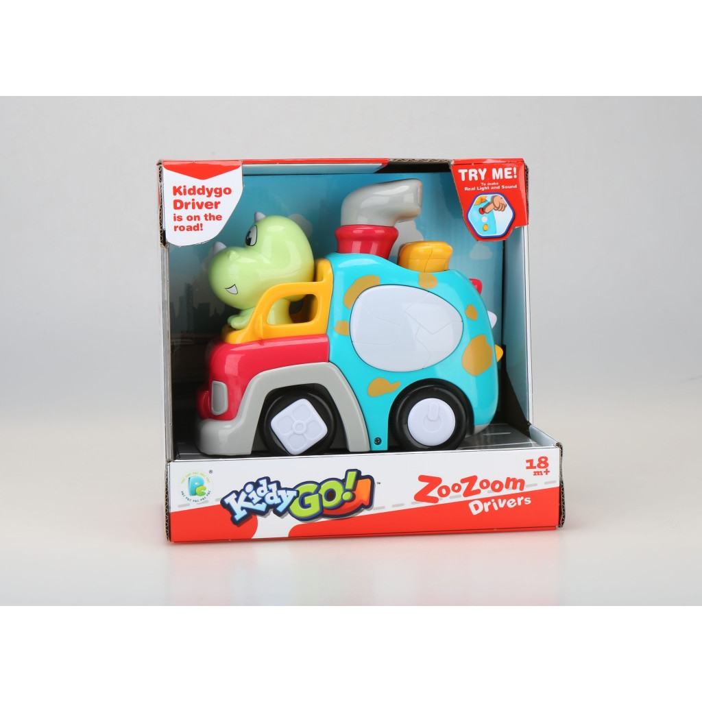 Zábavné Kiddy Go! autíčko s dinosaurem. Auto svítí a vydává zvuk po stisknutí tlačítek na zadní straně auta, auto vyžaduje baterie 3xAA, jsou součástí. Kolečka na volnoběh. Vhodné pro děti již od 18ti měsíců.