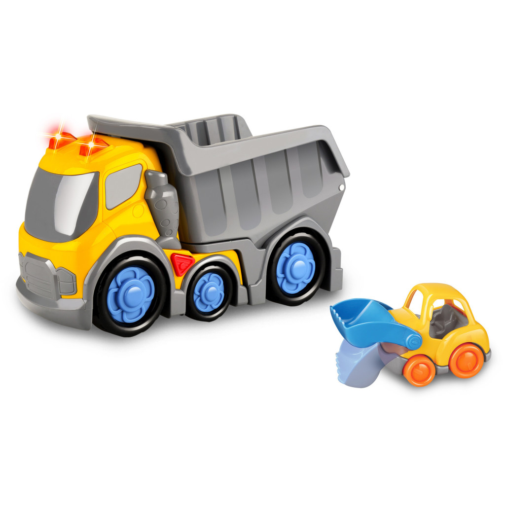 Kiddy Go! Nákladní auto s efekty. Balení obsahuje auto o velikosti 31 cm a malé autíčko. Nákladní auto nabízí světelné a zvukové efekty pro větší zábavu. Efekty se aktivují stiskem tlačítka na střeše kabiny. Nákladní auto má sklápěcí korbu. Kolečka na volnoběh. Auto vyžaduje 2xAA baterie, jsou součástí. Vhodné pro děti od 18ti měsíců.
