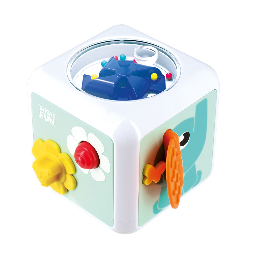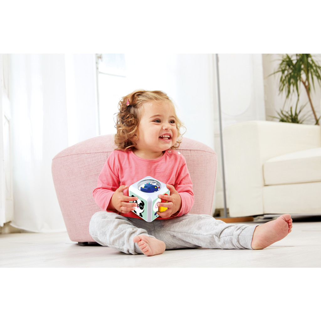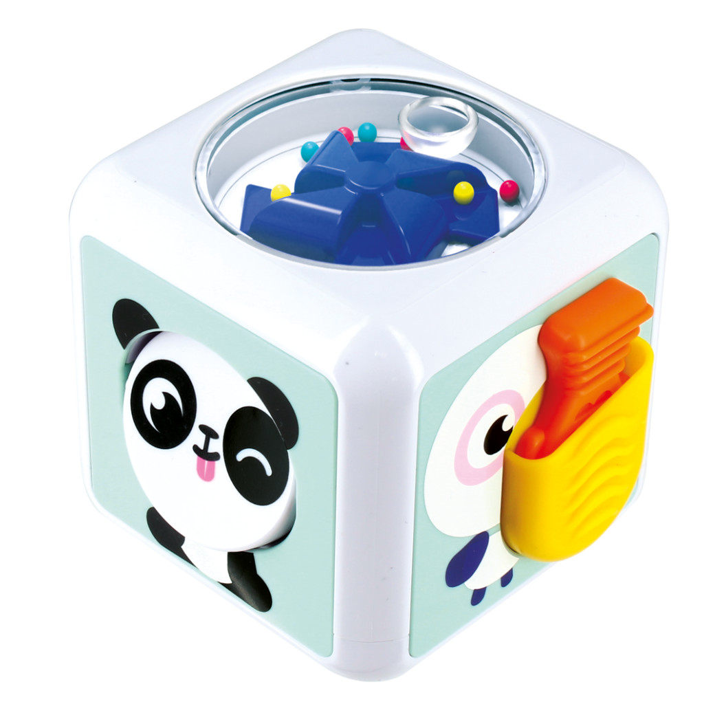 Senzomotorická hračka ve tvaru kostky. Kostka je vhodná pro děti od 12 měsíců.