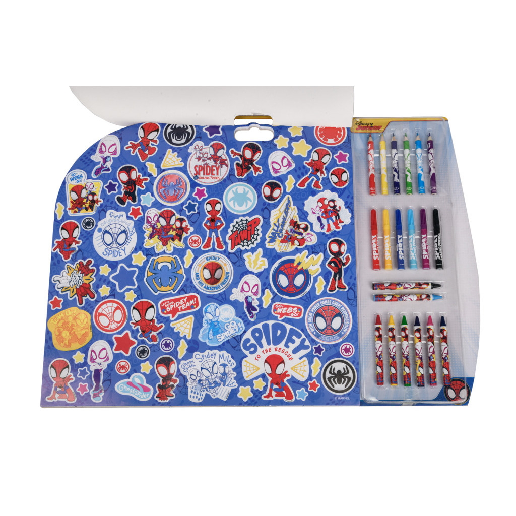 Malovací sada 5v1 Spidy obsahuje – 8 ks voskovek, 6 ks fixů, 6 ks pastelek, aršík s 84 samolepkami Spidy, 15 šablon a čisté papíry.