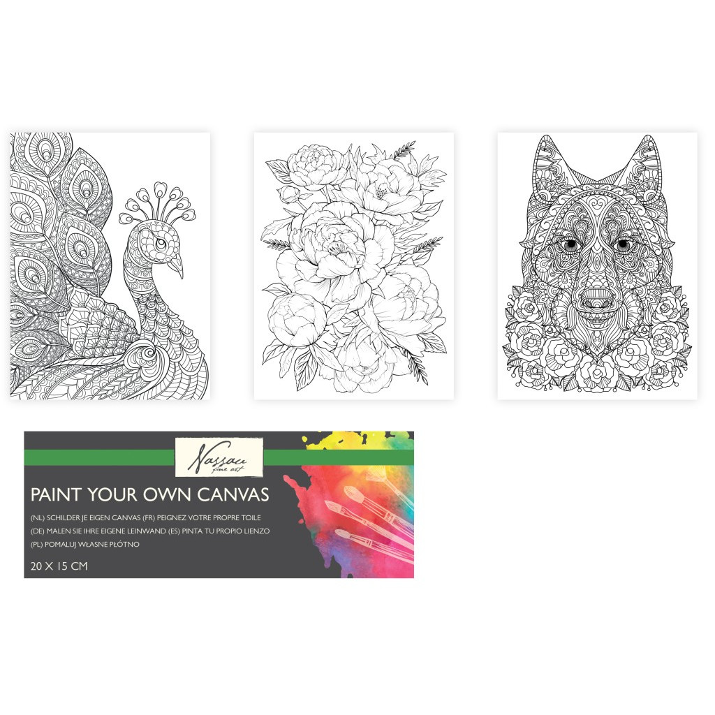 Malování na předtištěné plátno 20×15 cm – na plátně je předtištěný obrázek vlka, páva a kytice, který si vymalujete dle vlastní nálady.