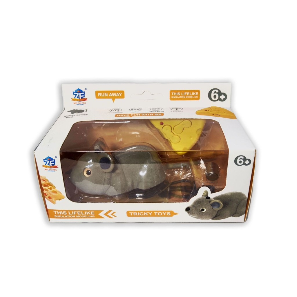 Myš na dálkové ovládání pomocí infrared. Balení obsahuje myš a ovladač ve tvaru sýra. Myš má demo pohybovací mód, dále lze ovládat na dálku. Myš jezdí vpřed, vzad, vlevo, vpravo. Při podržení tlačítka vlevo nebo vpravo se myš otáčí o 360°. Hračka vyžaduje baterie 1× 3,7V a 3× LR44, oboje součástí. Dosah ovladače až 8 m. Hrací čas cca 30 min. Na výběr dvě barevné varianty. Vhodné pro děti od 6ti let.