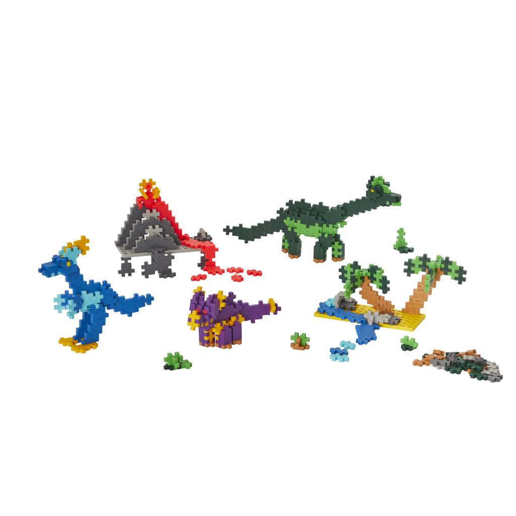 Kreativní sada PLUS-PLUS Nauč se stavět Dinosauři obsahuje celkem 600 dílků, ze kterých můžete podle podrobného návodu postavit různé dinosaury, nebo sopku a ostrov. Součástí balení jsou i 2 základní desky a návod.