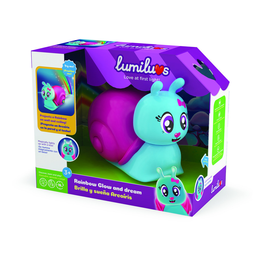 Šnek Lumiluvs po fouknutí na bříško a pusinku svítí. Zmáčkni šnekovi tlačítko na ulitě a na zdi a stropě se objeví duha. Výrobek vyžaduje 3× AAA baterie, které jsou součástí balení. Vhodné pro děti od 18 měsíců.