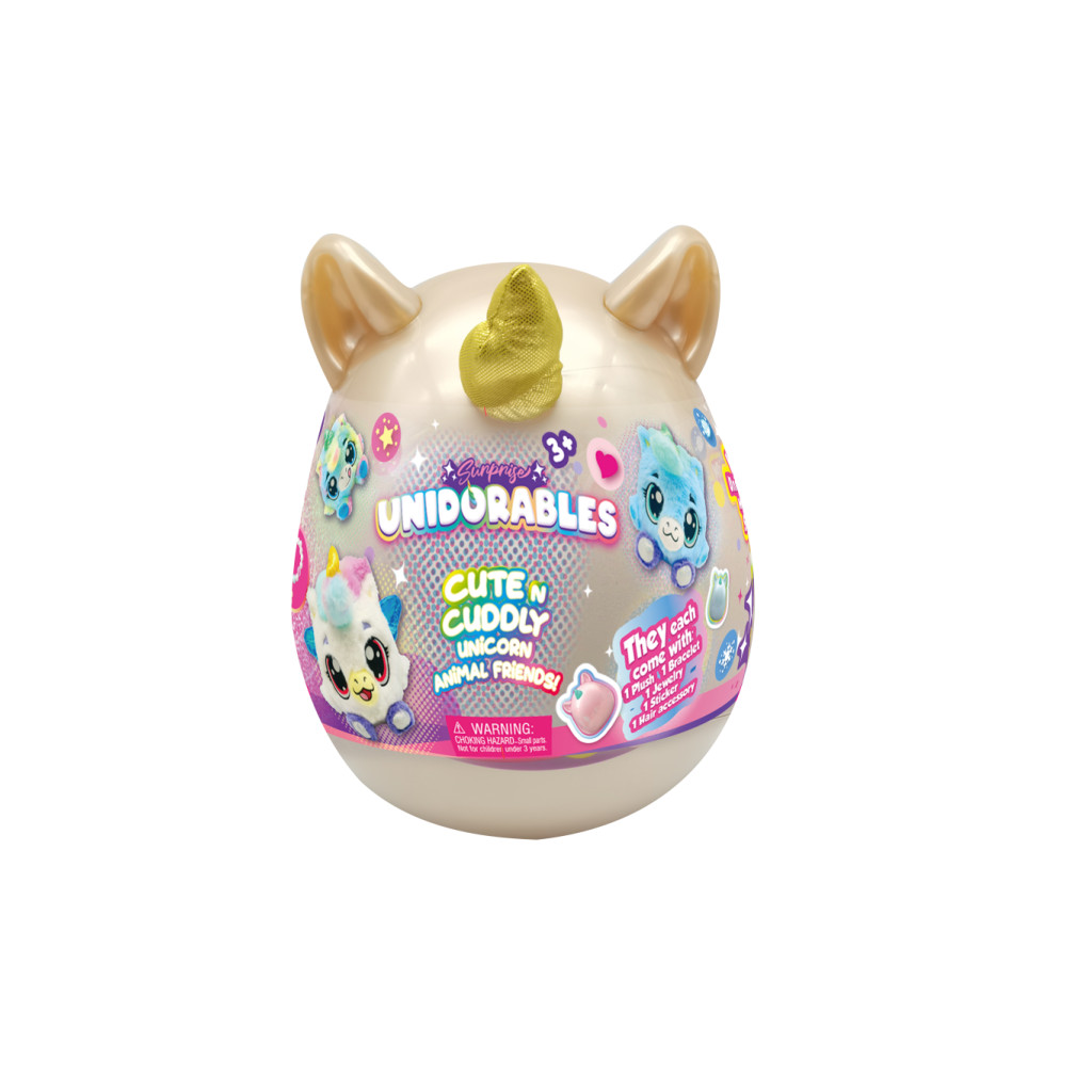 Nasbírej je všechny – 6 druhů. Přines si mě domů! 1× mini Unidorable v balení – roztomilý a jemný kamarád s rohem jednorožče. Který je uvnitř balení? Otevři mě a uvidíš. Open – otevři. Obsah balení: 1× plyšák, 1× náramek, 1× šperk, 1× nálepka, 1× vlasový doplněk.