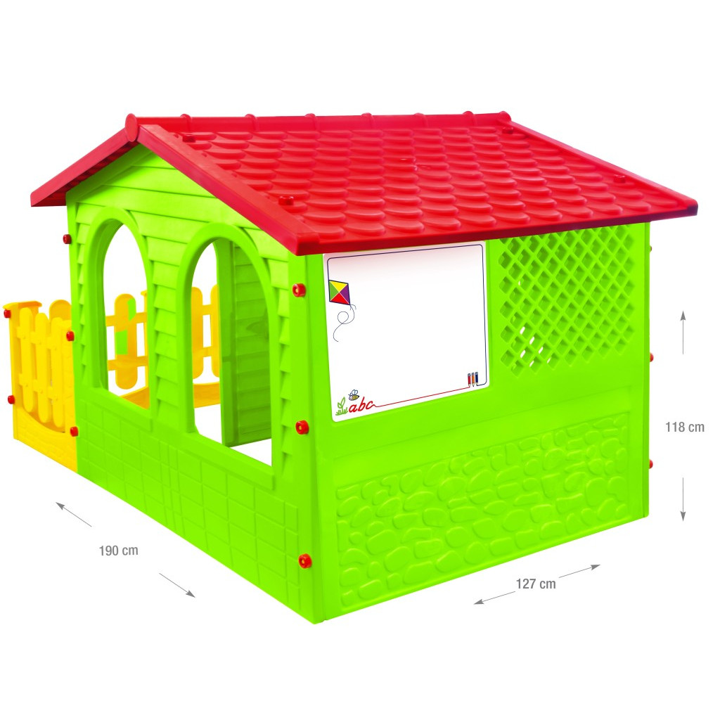 Zahradní domeček velký s plotem.Domeček má zavírací dvěre a okna. Obsahuje příslušenství – ptačí budku, truhlík, plot a polepky. Velikost domečku 190×128×120 cm. Vyrobeno z vysoce kvalitního plastu v EU.