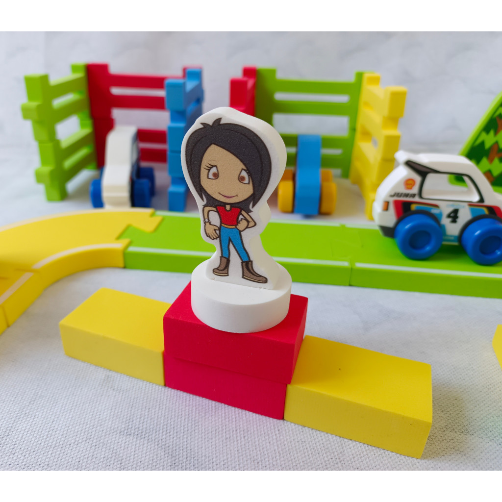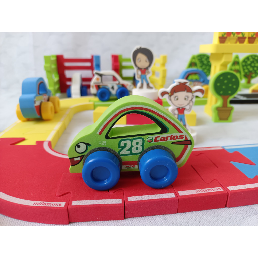 S FOAMINIS pěnovou stavebnicí se děti rázem ocitnou ve světě automobilových závodů. Na pestrobarevném závodním okruhu si užijí zábavu, napětí i vzrušení. Během hry si procvičí koordinaci oko-ruka, jemnou motoriku, barvocit, naučí se konstrukčnímu stavění. FOAMINIS podporuje u dětí vnímání okolního světa a jeho porozumění hravou formou. Barevné dílky o velikosti cca 5 – 20 cm jsou kombinovatelné a mají široké využití. Dílky lze snadno sestavovat jednoduchým zasunutím do sebe. Vyrobeno v České republice.