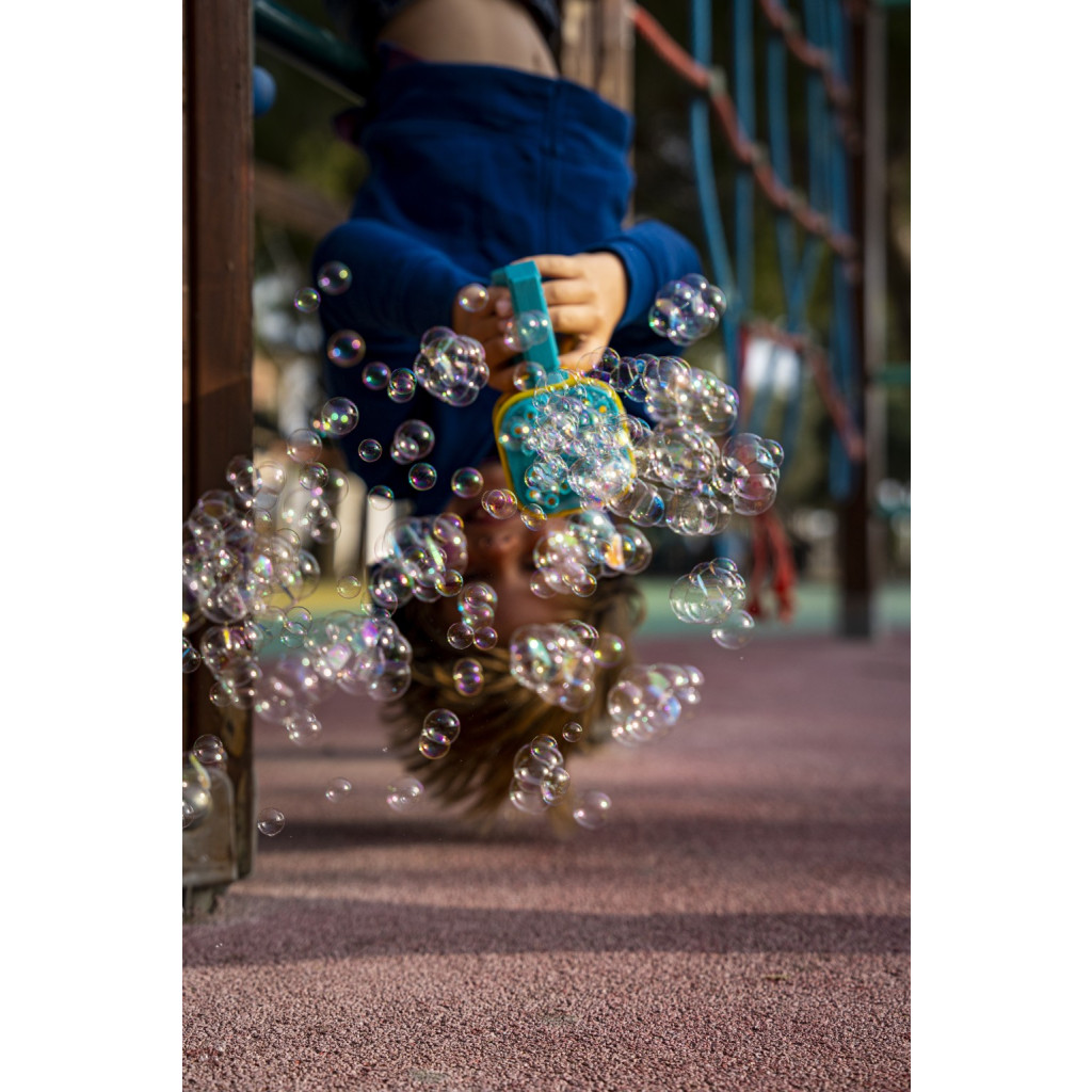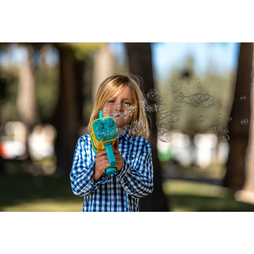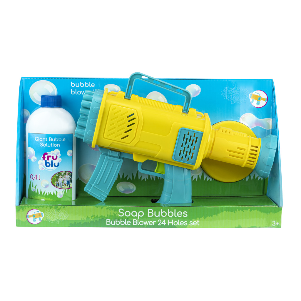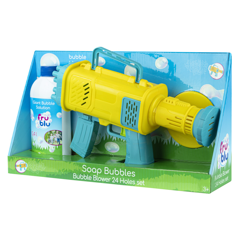 Tento zcela nový super blaster vypouští miliony bublinek vystřelujících s obrovskou rychlostí a zahalí tak vše kolem tebe do duhových bublin. Blaster má zásobník na tekutinu, díky kterému je bublinování ještě rychlejší a snadnější. Ideální pro hru venku a v interiéru. V balení s 0,4l náplně. Bubliny FRU BLU dosahují obrovských rozměrů a mají neskutečné tvary. Září všemi barvy duhy. Bubliny FRU BLU vznikají díky speciální tekutině, která je produkovaná v EU. Jsou trvanlivé a jen tak neprasknou.