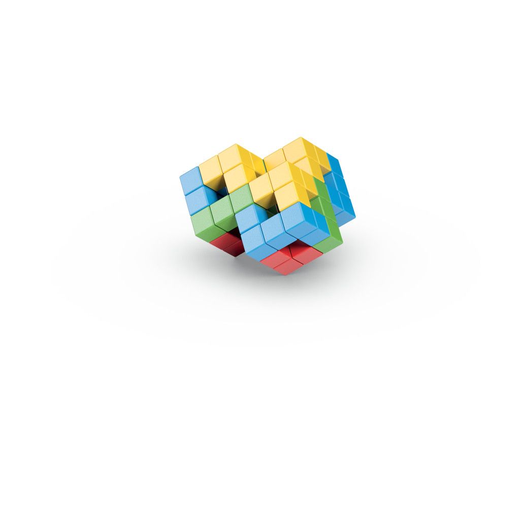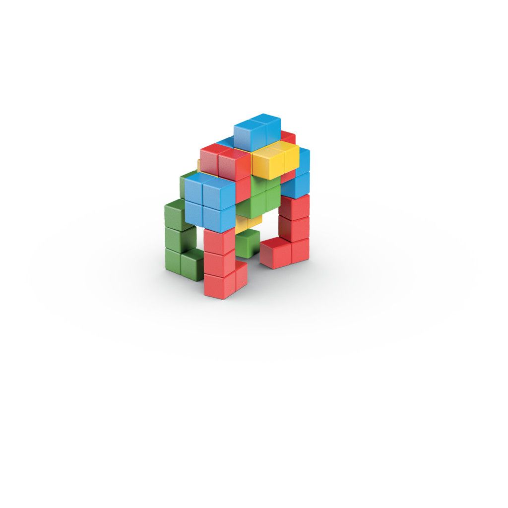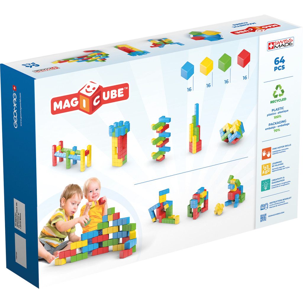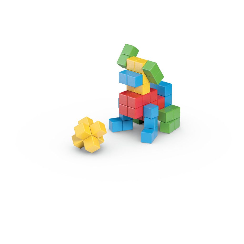 Díky speciální vnitřní konstrukci se magnetické kostičky přitahují ze všech šesti stran a drží i volně v prostoru - stavění ve 3D. Obsahuje 64 kostek ve čtyřech barvách. Vhodné od 1 roku.