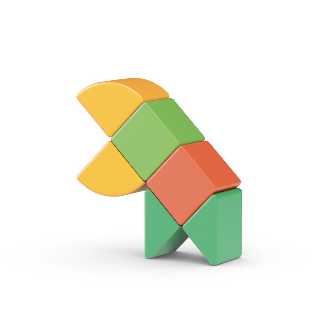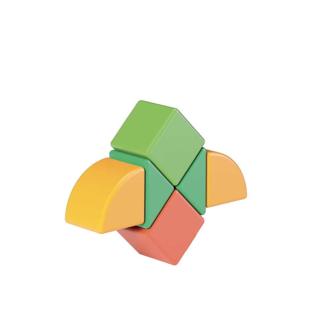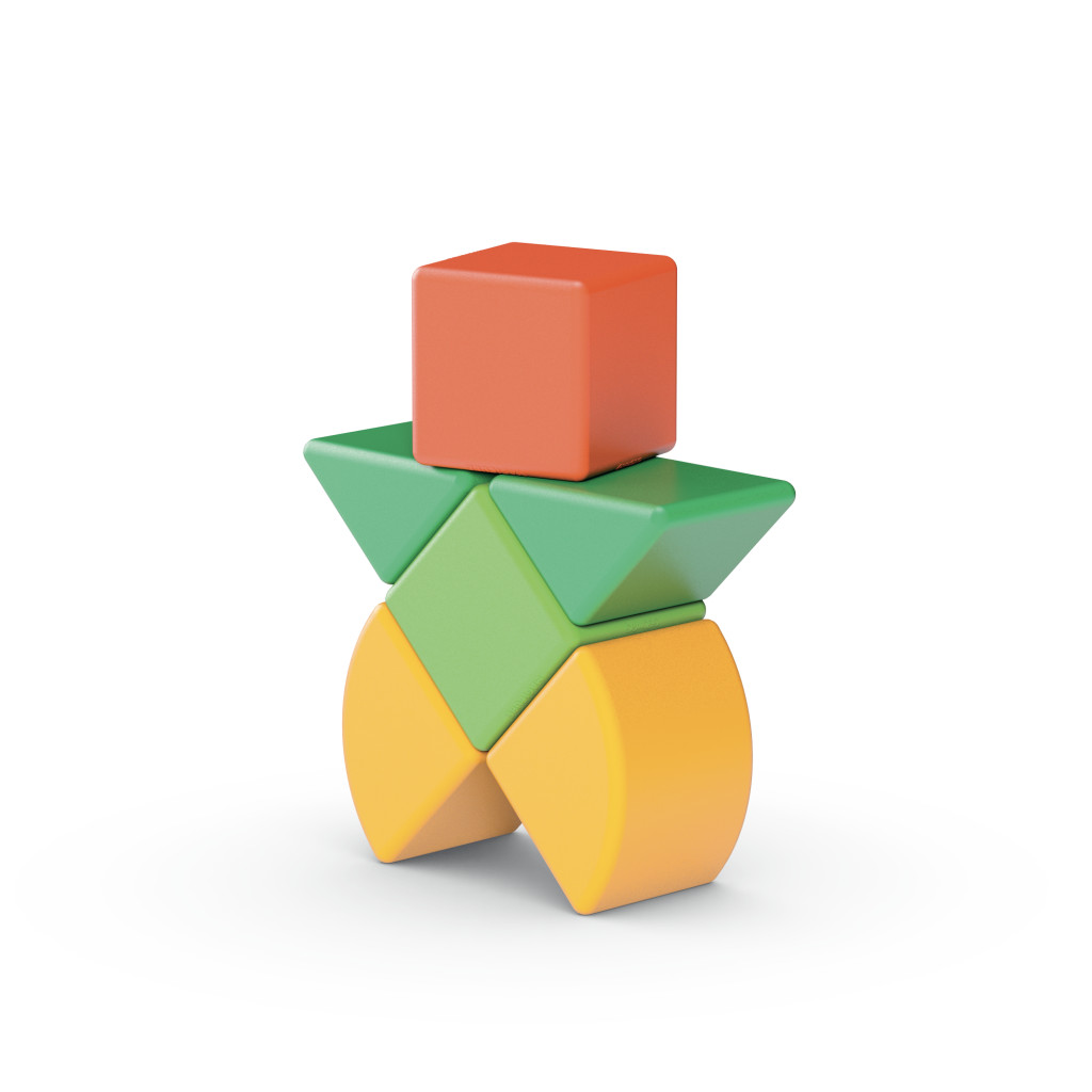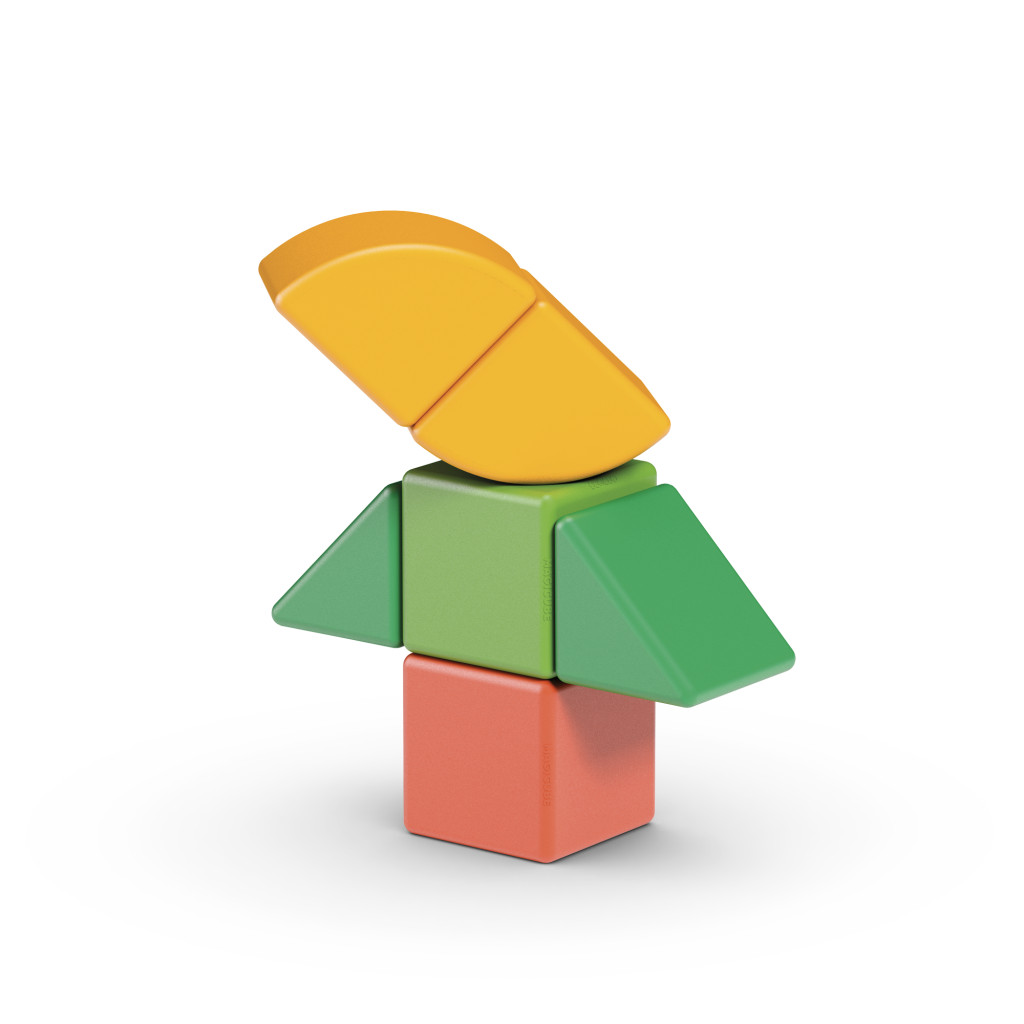Kromě magnetických krychliček jsou součástí této sady také další dva magnetické tvary. Obsahuje 6 dílků. Vhodné od 1 roku.