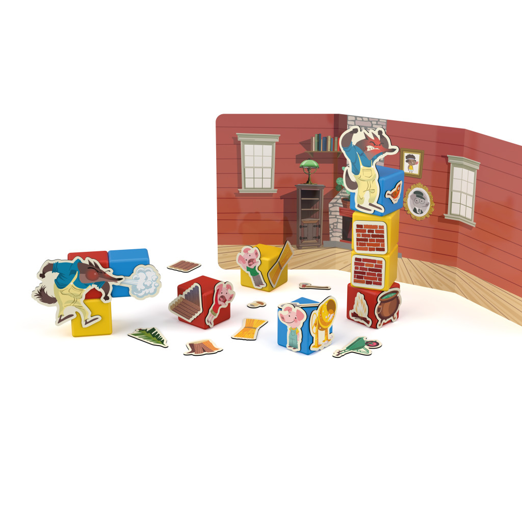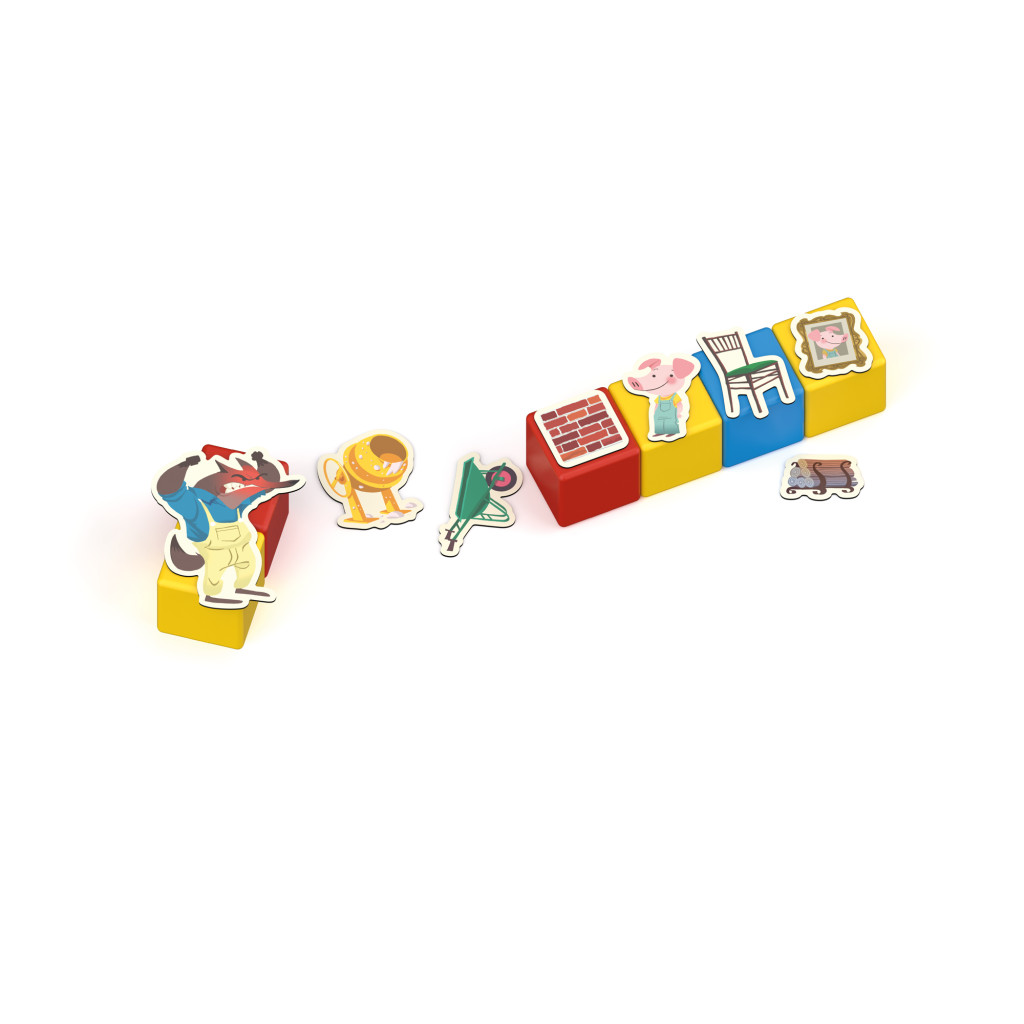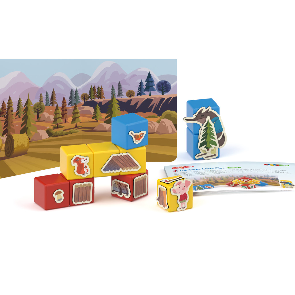 Rodiče čtou pohádku O třech malých prasátkách a děti ji přikládáním klipů k magnetickým kostičkám sami vytváří. Nebo můžete vymýšlet pohádky vlastní. Součástí je text v češtině a slovenštině. Obsahuje 10 magnetických kostek, 31 klipů s obrázky a oboustrannou kartu s motivem domu a lesa. Vyrobeno ze 100% recyklovaného materiálu. Vhodné pro děti od 3 let.