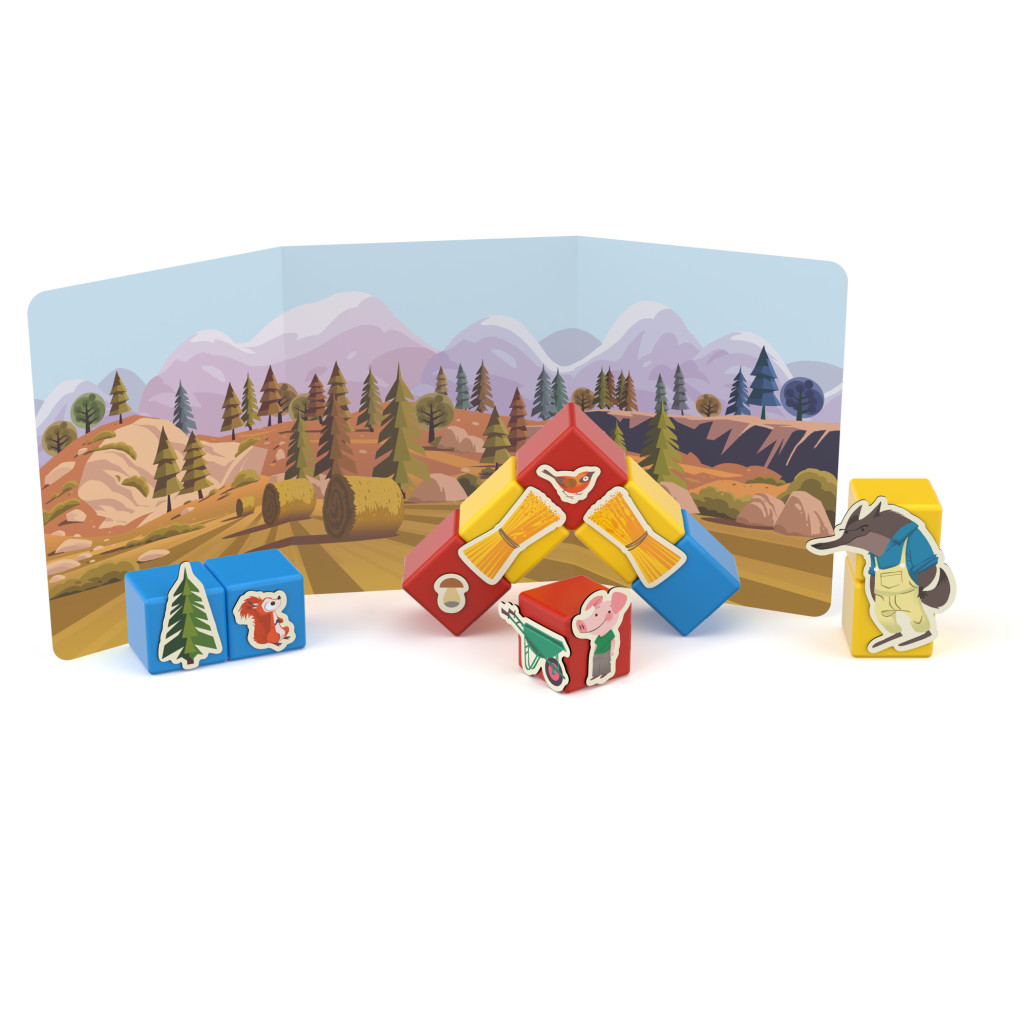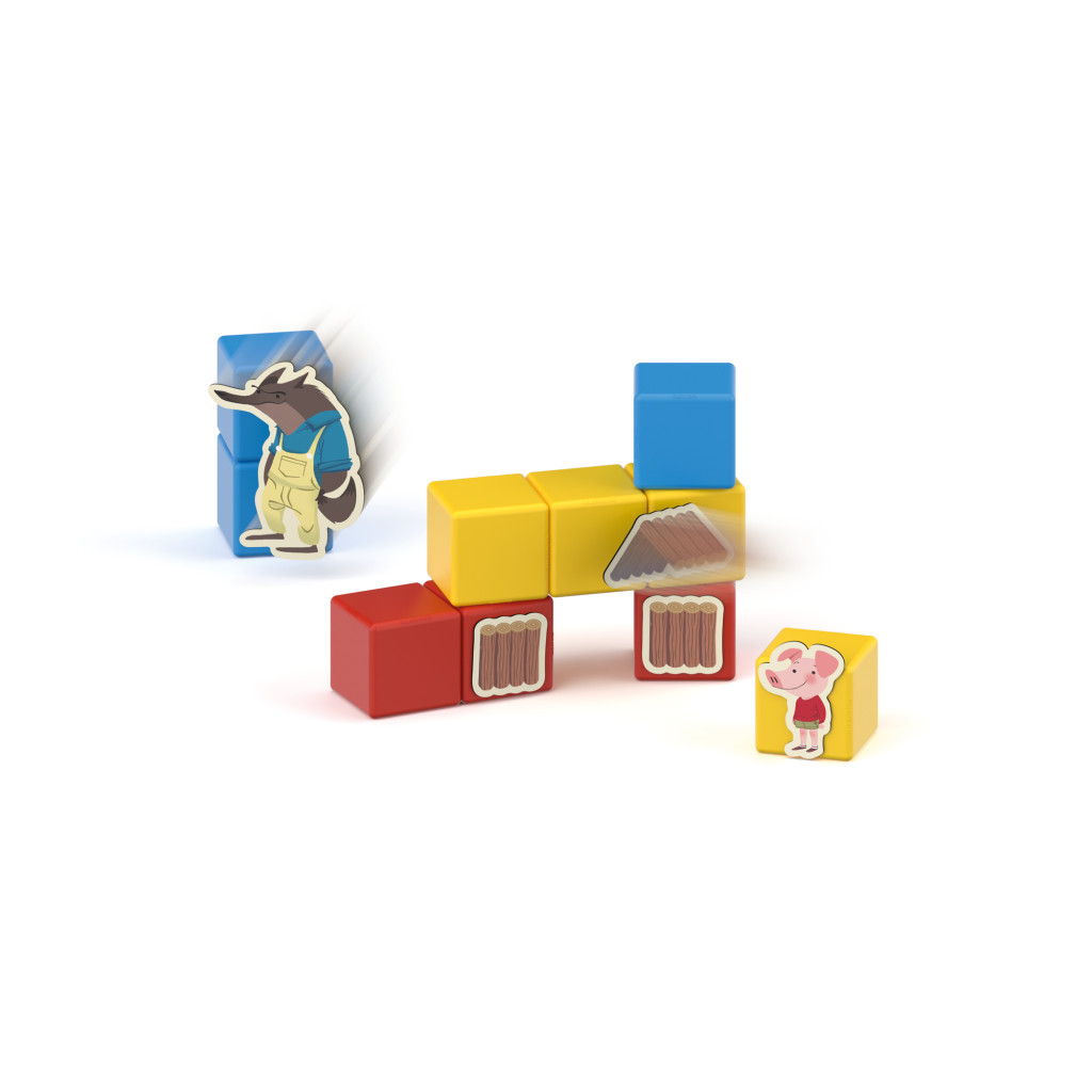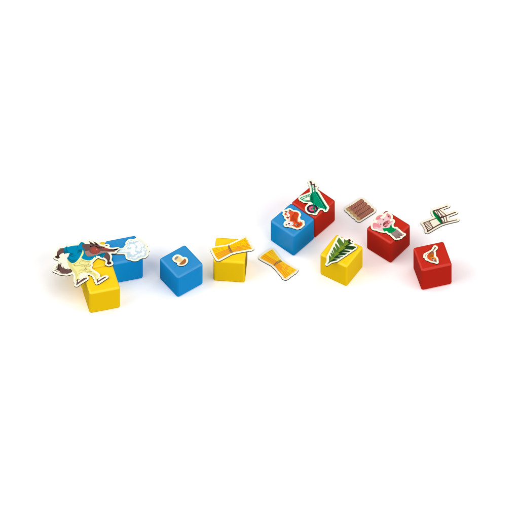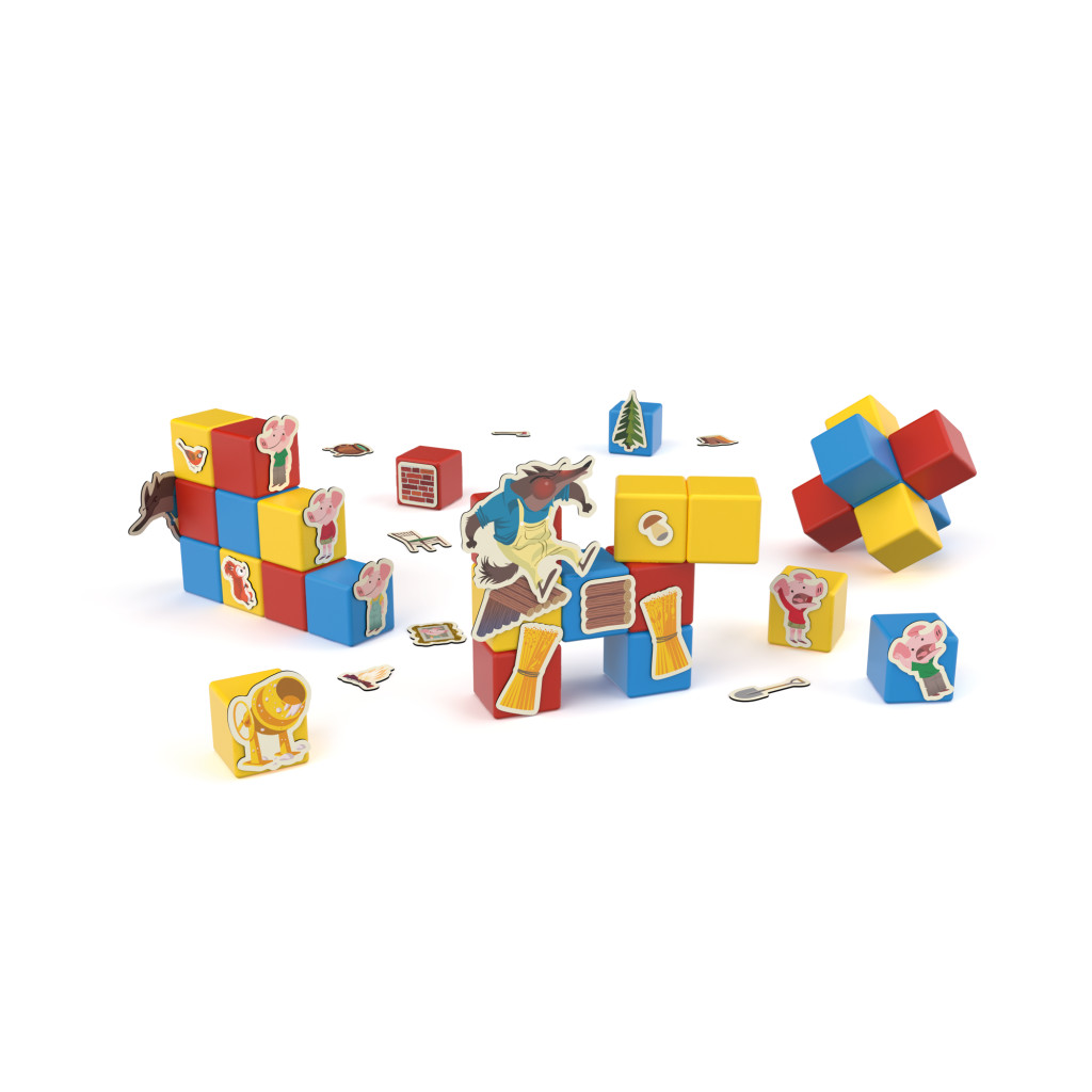 Rodiče čtou pohádku O třech malých prasátkách a děti ji přikládáním klipů k magnetickým kostičkám sami vytváří. Nebo můžete vymýšlet pohádky vlastní. Součástí je text v češtině a slovenštině. Obsahuje 10 magnetických kostek, 31 klipů s obrázky a oboustrannou kartu s motivem domu a lesa. Vyrobeno ze 100% recyklovaného materiálu. Vhodné pro děti od 3 let.