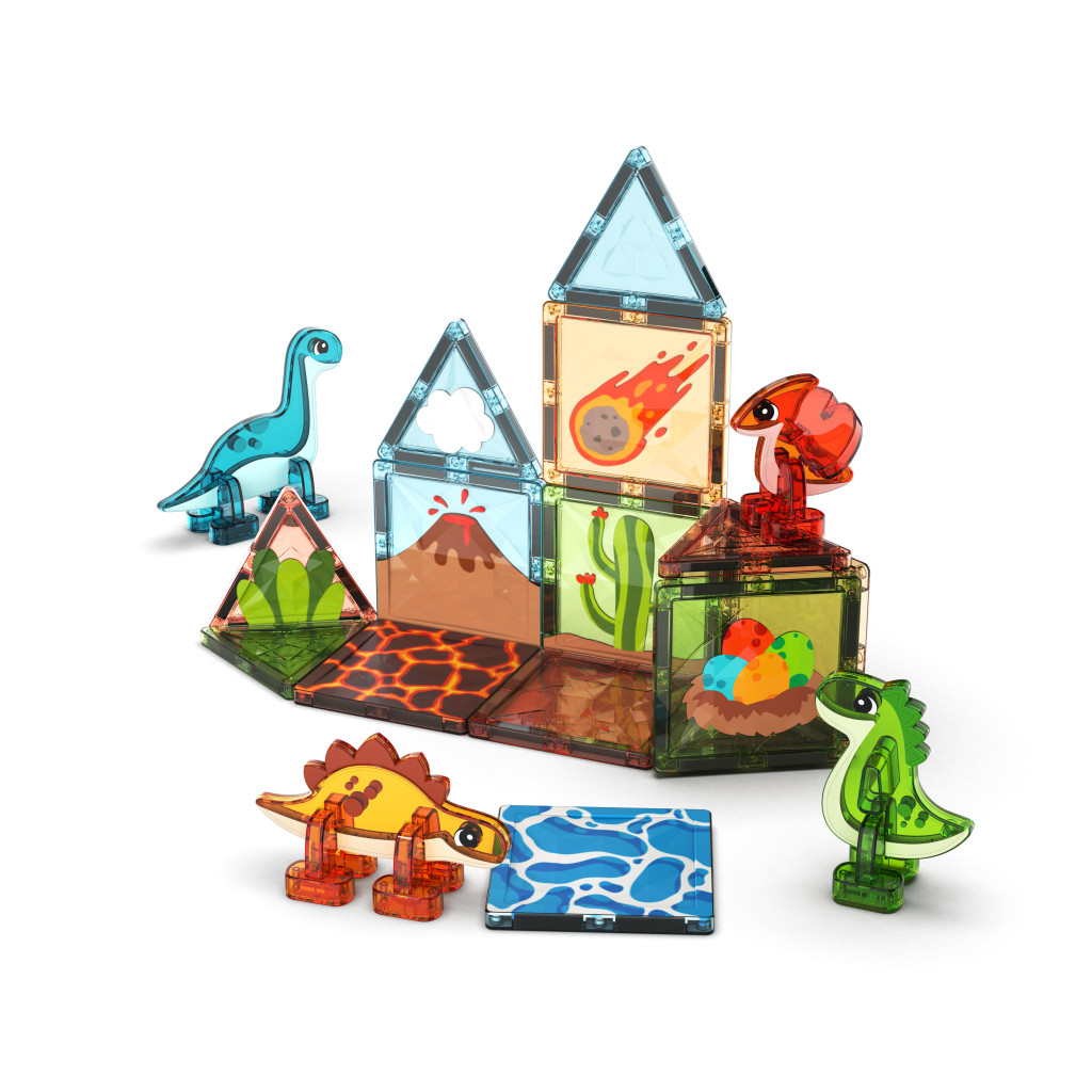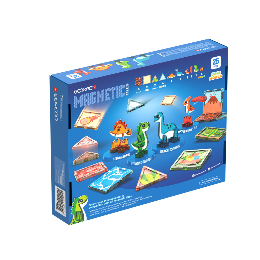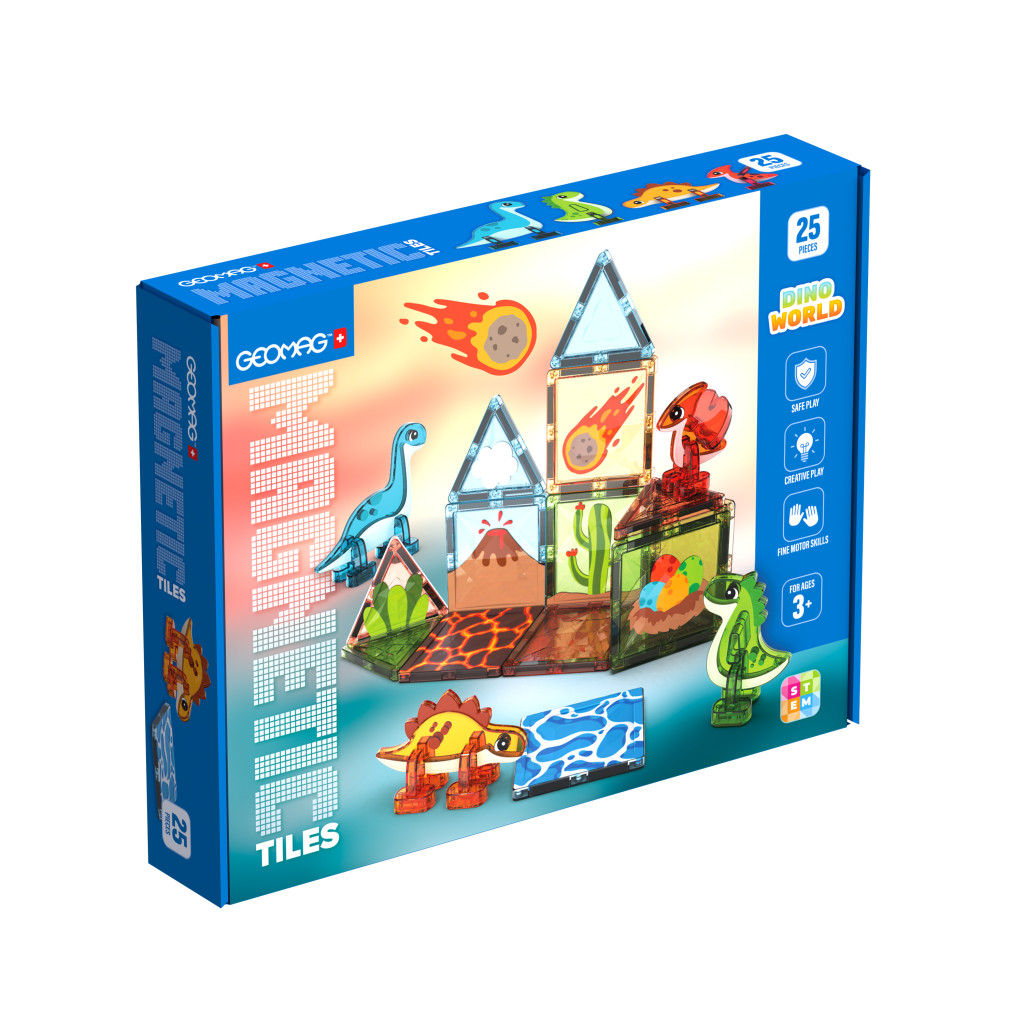 Geomag Magnetic Tiles Dino obsahuje magnety na všech stranách jednotlivých geometrických tvarů. Lze tak snadno vytvářet jakékoliv 2D obrazce nebo 3D struktury. Kromě toho jsou součástí i 4 figurky dinosaurů. Stavebnice rozvíjí manuální zručnost, kreativitu a fantazii, učí barvy, geometrické tvary, ale hlavně si s ní děti užijí spoustu zábavy. Obsahuje celkem 25 dílků. Vhodné od 3 let.