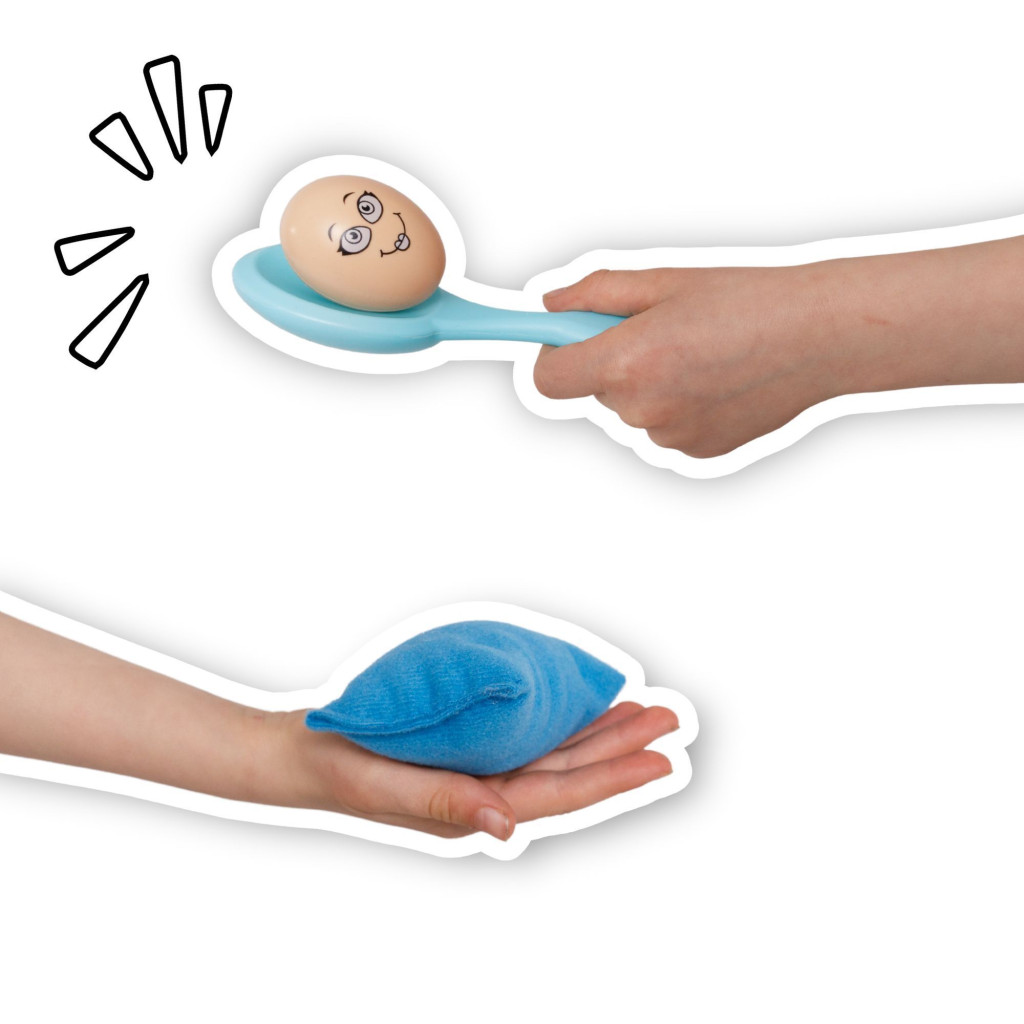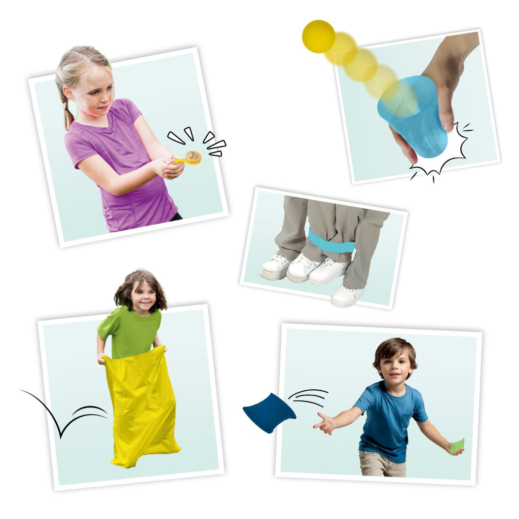 Velká sada pěti her pro čtyři osoby nebo týmy (skákání v pytlích, závod s vejcem a lžičkou, házení pytlíkem, třínohý závod, hra s míčkem), včetně časomíry a 4 medailí.