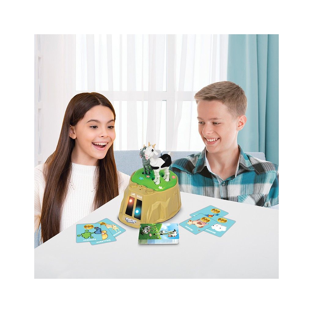 Kozo,padni! Obsah: 1 herní základna, 2 figurky-kozy, 42 hracích karet, 1 arch nálepek, návod k použití (pro 2 a více hráčů) Vydejte správný zvuk se správnou úrovní hluku, abyste vyplašili kozy a přiměli je omdlít! Pokaždé, když se vám to podaří, tak vyhrajete danou kartu. Staňte se prvním hráčem, který nasbírá 10 kozích bodů!Použijte 3× baterie "AA“ 1,5V (nejsou součástí balení