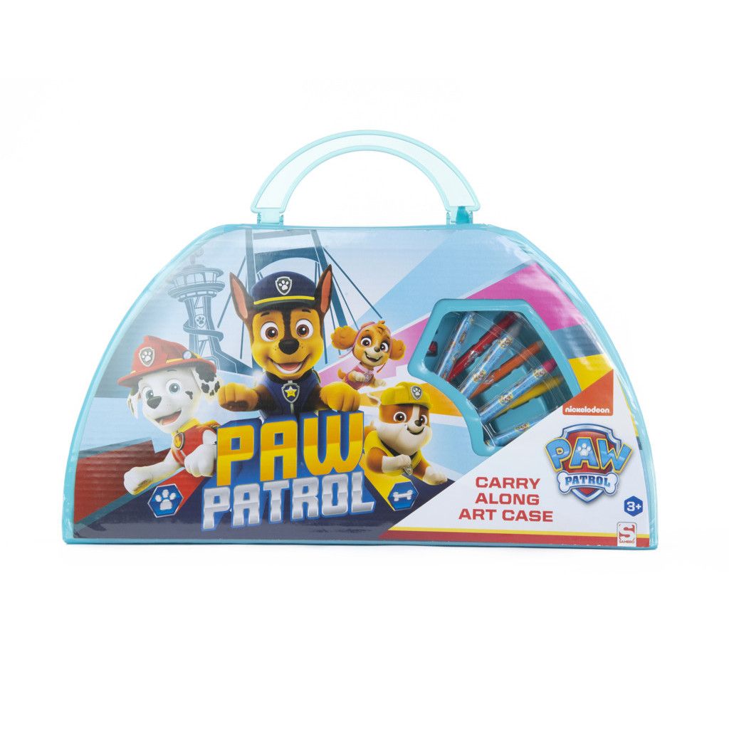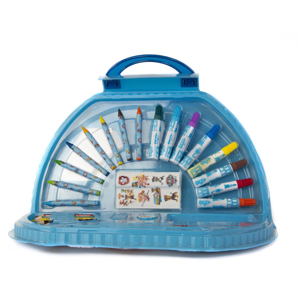 Kufřík malovací kovový Tlapková Patrola – obsahuje fixy, voskovky, pastelky, vodovky, obyčejné tužky, pravítko, gumu, ořezávátko, štětec a samolepky.