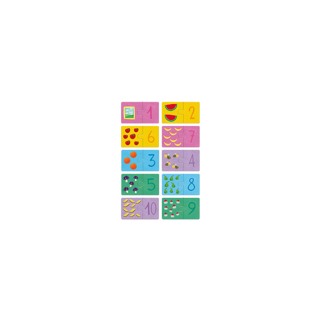Barevné puzzle s vyobrazením předmětů a čísel. Cílem hry je přiřadit správný počet předmětů k odpovídajícímu číslu. Hrou s puzzle děti rozvíjejí logické a matematické myšlení.