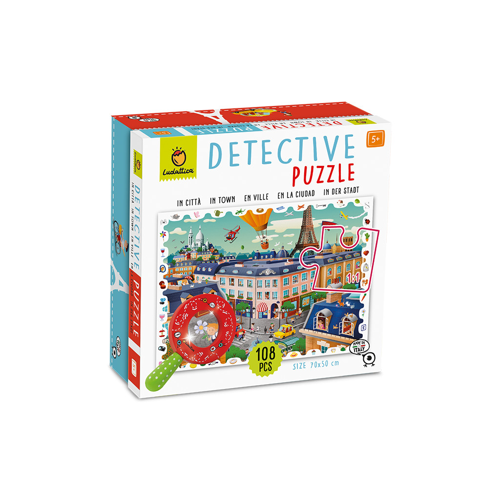 Detektivní puzzle odhalující svá tajemství prostřednictvím speciální lupy zaujme děti i dospělé. Pátrej ve městě a užij si přitom spoustu zábavy!