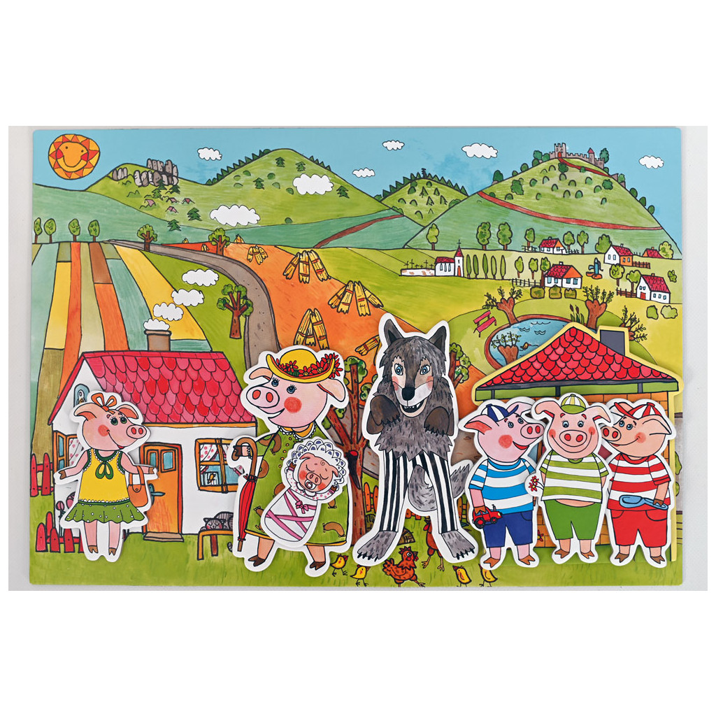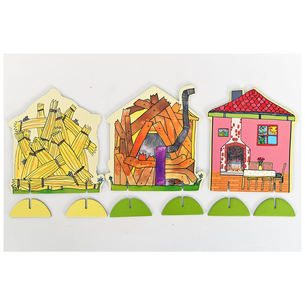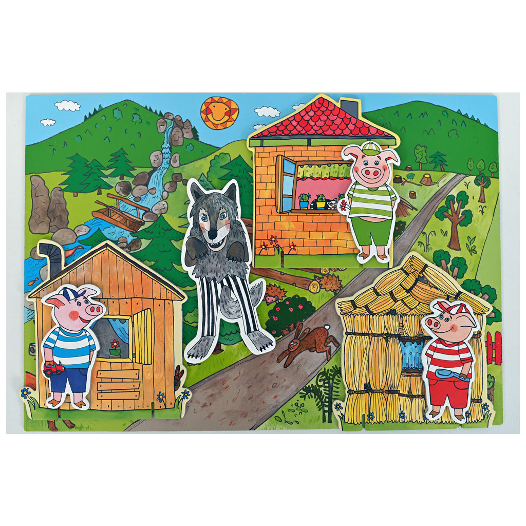 V balení naleznete loutky a kulisy k pohádce O třech prasátkách. 6 nádherných loutek, 3 rekvizity. Maminka prasátko, 3 prasečí kluci, jedna holčička a malé prasečí miminko. Tři domečky. Ze slámy, ze dřeva a z cihel. Oboustranná zadní kulisa.