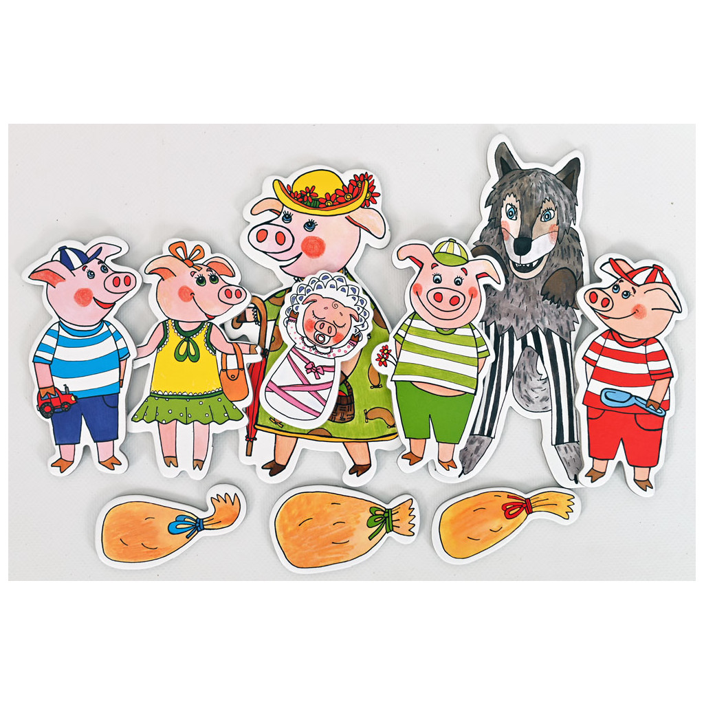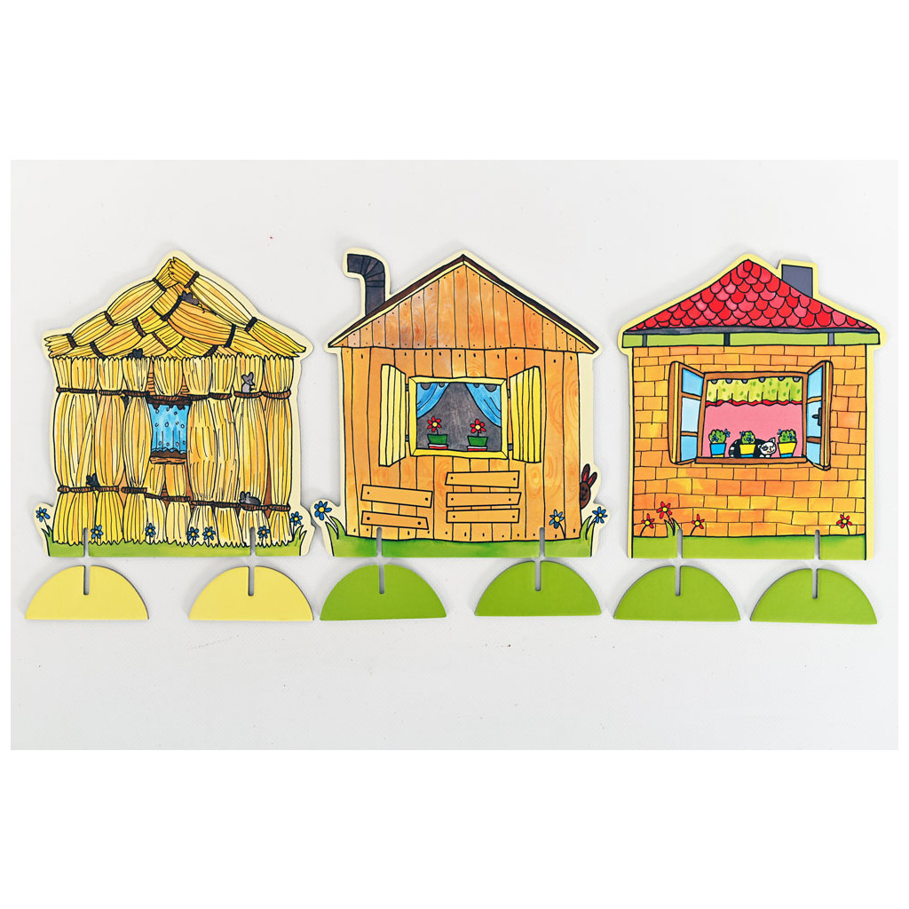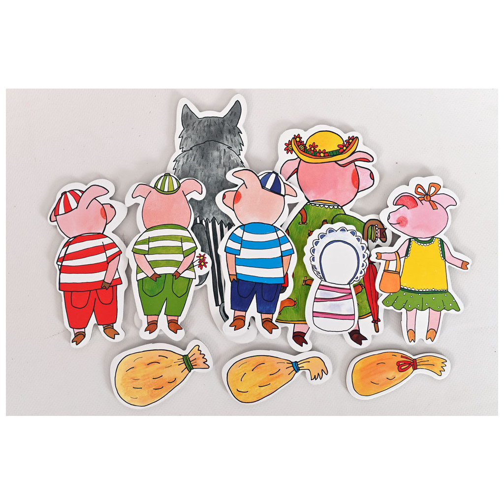 V balení naleznete loutky a kulisy k pohádce O třech prasátkách. 6 nádherných loutek, 3 rekvizity. Maminka prasátko, 3 prasečí kluci, jedna holčička a malé prasečí miminko. Tři domečky. Ze slámy, ze dřeva a z cihel. Oboustranná zadní kulisa.