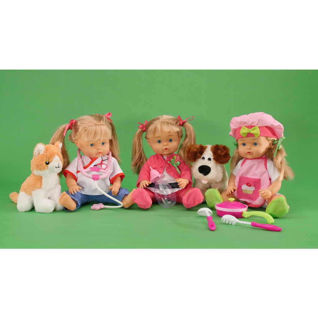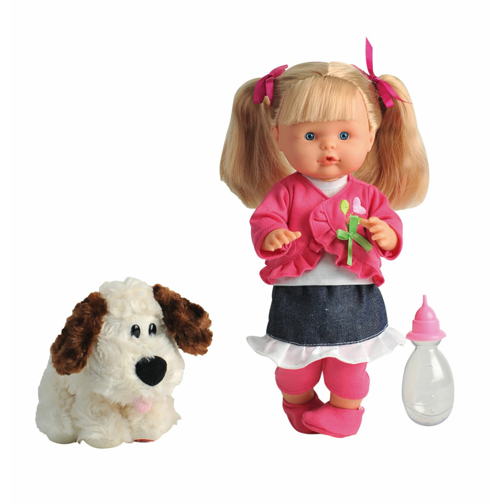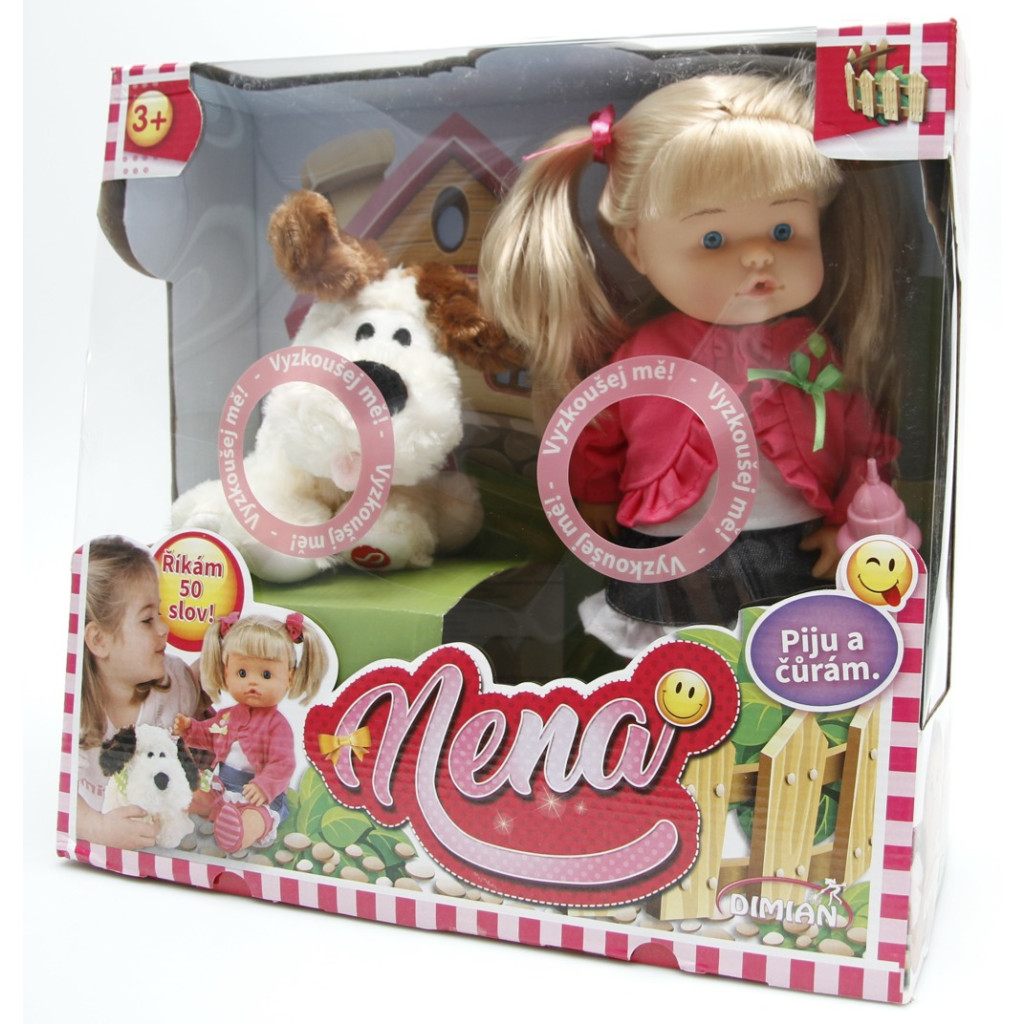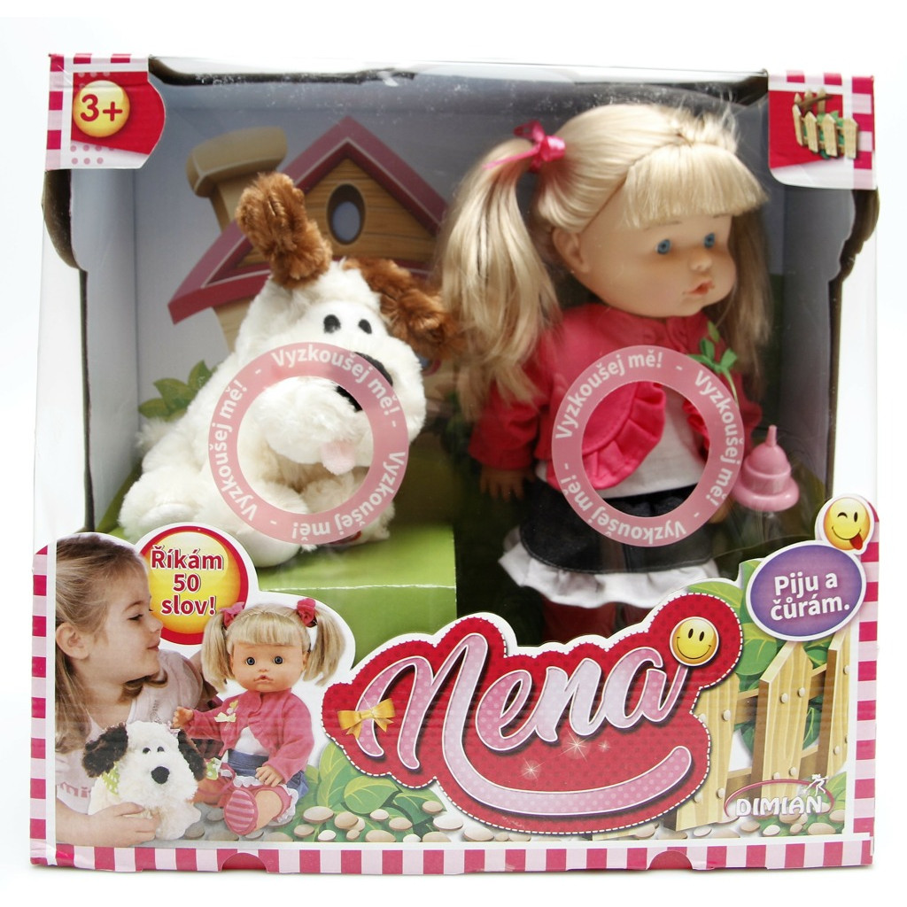 Panenka Nena umí 50 slov, pije a čůrá. Obsah balení: Nena 36cm, pejsek, lahvička na pití.