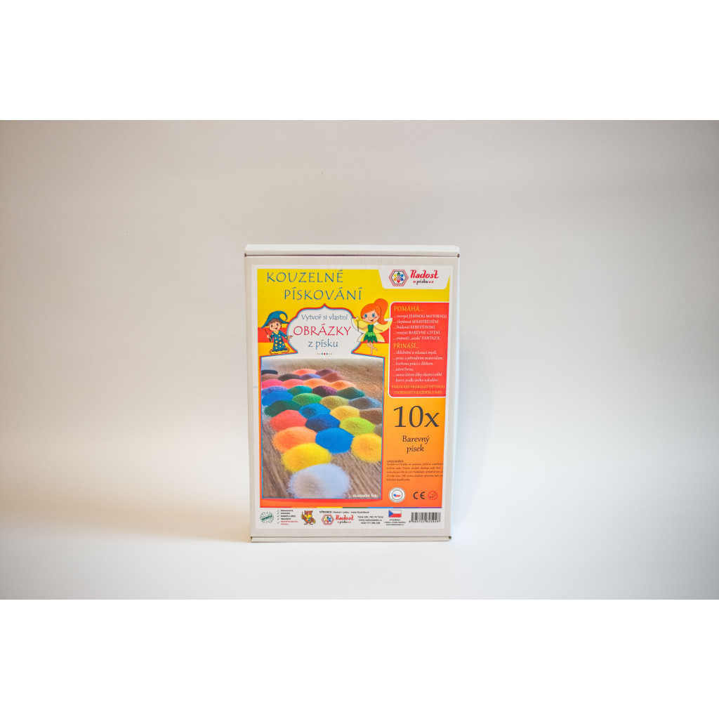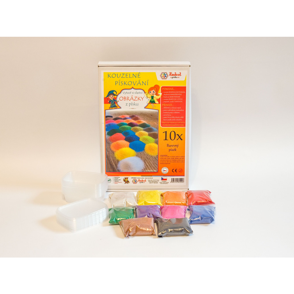 Tento set je skvělým doplňkem pro PÍSKOVÁNÍ Kreativní sady, se kterými mohou děti vytvářet pestrobarevné obrázky. Rozšíří možnosti tvoření i míchání barev. Hra s pískem podporuje fantazii, vede k estetickému cítění, rozlišování barev, zlepšuje jemnou motoriku, umožňuje zklidnění a relaxaci. Vyrobeno v České republice, Radost v písku.