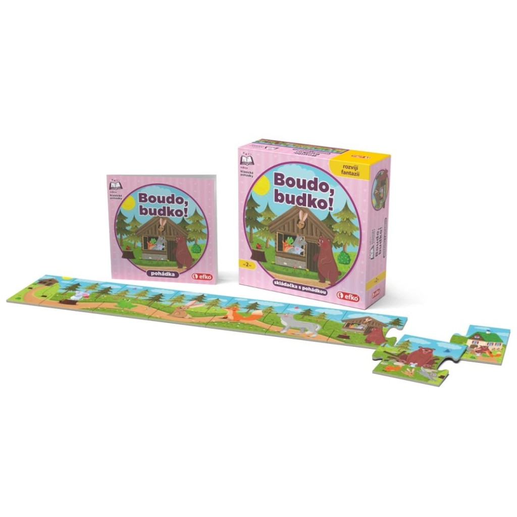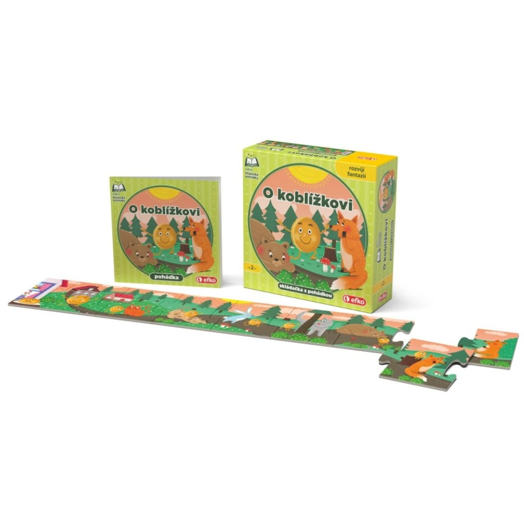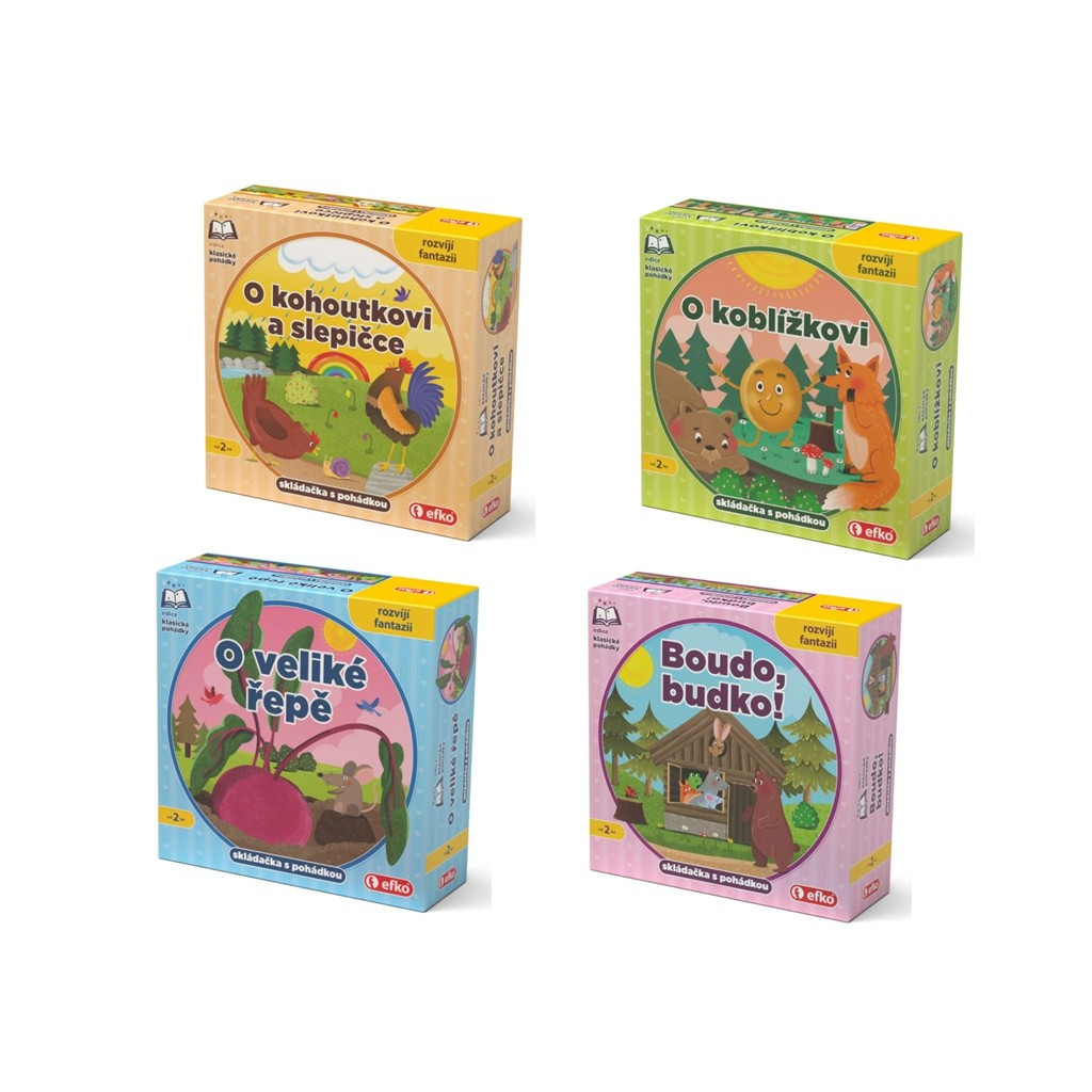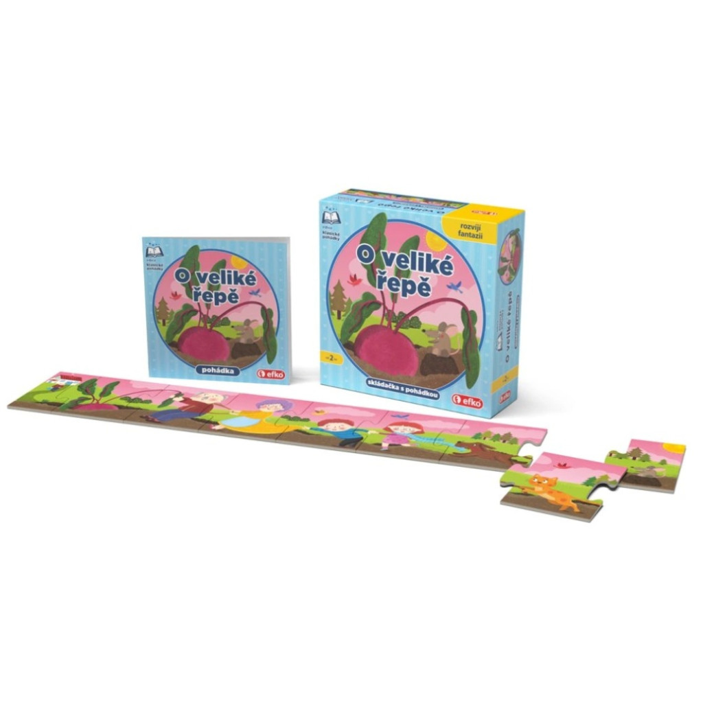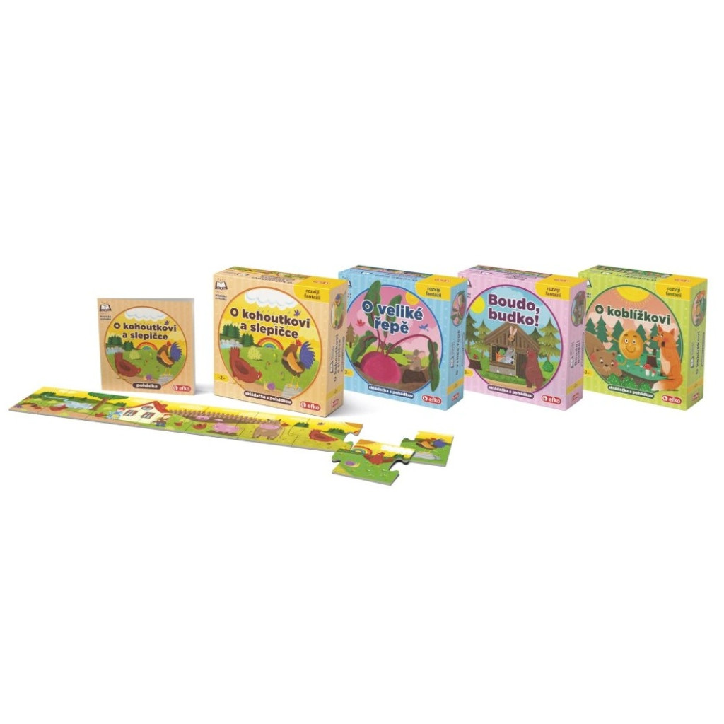 Herní set Puzzle s pohádkou obsahuje čtyři druhy puzzle (O kohoutkovi a slepičce, Boudo, budko, O Koblížkovi, O veliké řepě). Součástí balení jsou pohádky k předčítání. Za pomoci extra velkých dílků, které připomínají stránky leporela, si můžete s dětmi povídat o postavách příběhu a následně je nechat sestavit obrázek s konkrétní pohádkou. Hrou s puzzle děti procvičují koordinaci oko-ruka, jemnou motoriku, seznamují se s tradičními pohádkami, rozšiřují svou slovní zásobu, zlepšují vyjadřovací schopnosti.
