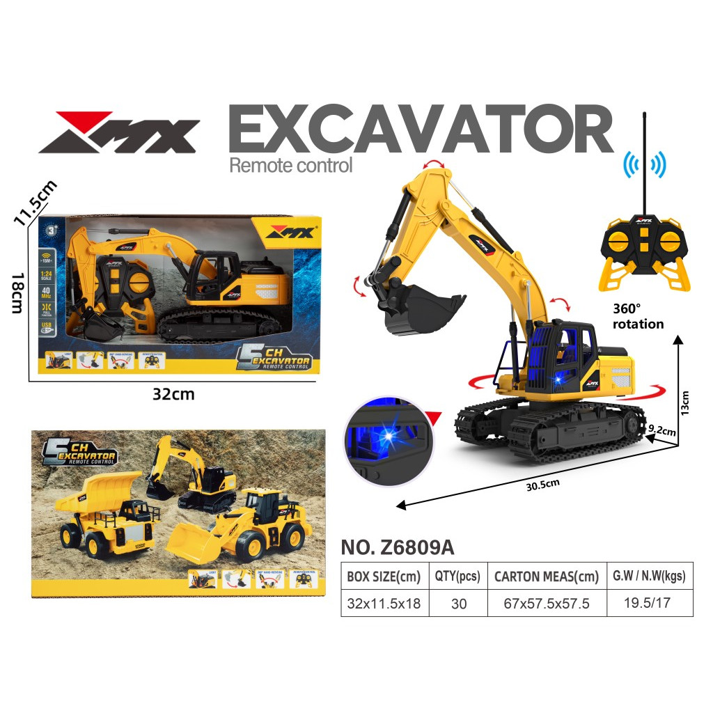 Realistický RC bagr v měřítku 1:24 s plným ovládáním: jízda vpřed/vzad, otáčení, zvedání a spouštění lžíce, 360° otáčení věže. Ovládání probíhá na frekvenci 40 MHz, dosah dálkového ovladače je 10–15 m. Bagr má světelný efekt, USB nabíjení a dosahuje rychlosti 2–3 km/h.