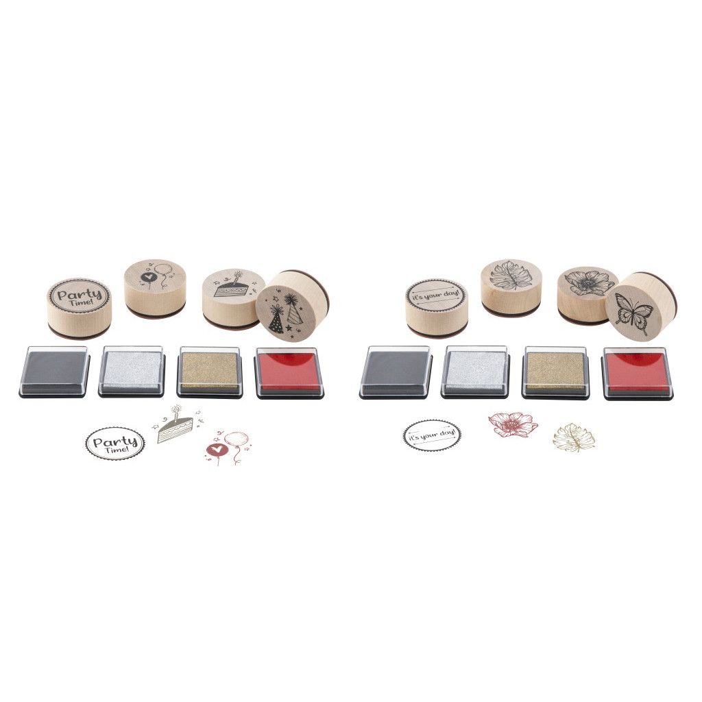 Sada 4 dřevěných razítek + polštářek – sada obsahuje 4 dřevěná razítka a inkoustový polštářek. Dva druhy razítek – párty a příroda.