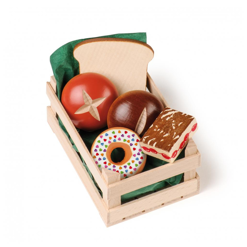 5 ks pečiva z bukového dřeva v dřevěné přepravce. Obsah: 1x toustový chléb plátek, 1x houska, 1x louhoaná houska hvězdička, 1x donut, 1x čokoládový dortík. Rozměry (d x š x v) cm / hmotnost: 12,2 x 8,3 x 6 / 158 g. Určeno pro věk: 3+. Dřevěné ovoce, zelenina, potraviny a drogerie na hraní, jako výbava do dětské prodejny a kuchyňky na doma i do školky. Pomáhá dítěti rozvíjet fantazii, kreativitu, komunikaci a jemnou motoriku. Skvělá hračka pro hru na obchůdek a vaření, která baví holky i kluky bez rozdílu. Z dětí se tak rázem může stát profesionální kuchař, prodavač, zákazník, farmář, pekař, zmrzlinář nebo kdokoliv je jen napadne. Všechny výrobky Erzi splňují standardy nejvyšší kvality a jsou výsledkem precizního řemeslného zpracování, jsou přísně testovány a certifikovány v Německu a odpovídají příslušným evropským normám. Upozornění: Není určeno dětem do 3 let, obsahuje malé vdechnutelné části. Tento výrobek je hračka, ne potravina. Uschovejte informace o výrobku a kontakt na výrobce.Doplňkové parametry