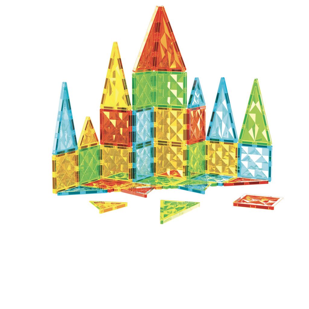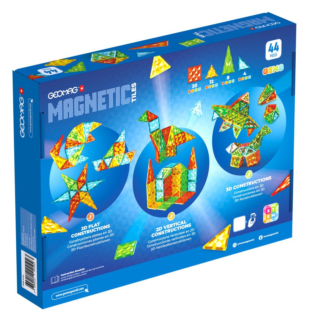 Geomag Magnetic Tiles 44 dílků obsahuje magnety na všech stranách jednotlivých tvarů. Lze tak snadno vytvářet jakékoliv 2D obrazce nebo 3D struktury. Stavebnice rozvíjí manuální zručnost, kreativitu a fantazii, učí barvy, geometrické tvary, ale hlavně si s ní děti užijí spoustu zábavy. Obsahuje 44 průhledných strukturovaných dílků ve čtyřech barvách – 20 čtverců, 12 rovnostranných trojúhelníků, 8 rovnoramenných trojúhelníků a 4 pravoúhlé trojúhelníky. Vhodné od 3 let.