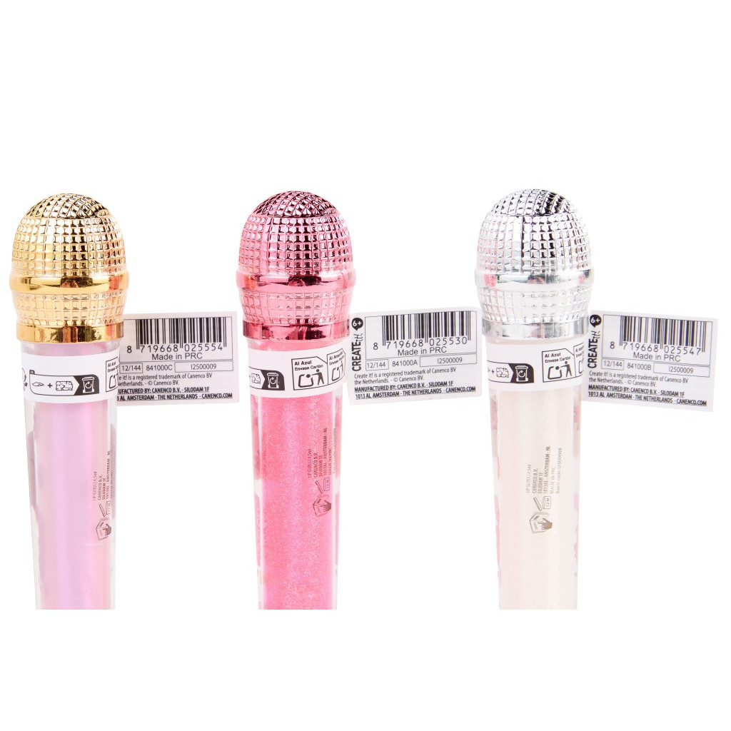 Lesk na rty ve tvaru mikrofonu.tylový lesk na rty ukrytý v originálním obalu ve tvaru mikrofonu. Poskytuje jemný lesk a příjemnou péči pro rty, ideální pro malé fanoušky make-upu a zpěvu. Ve třech barvách růžovo/zlatý, růžovo/stříbrný a růžovo/růžový.