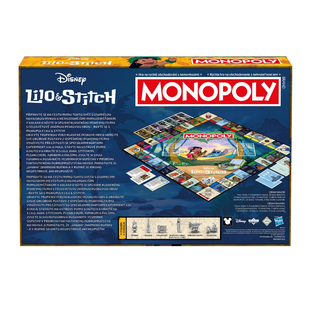 Oblíbená stolní hra Monopoly v originálním designu inspirovaném pohádkou Lilo a Stitch. Hráči nakupují a prodávají lokace z havajského světa Lilo a jejího mimozemského kamaráda, sbírají nájemné a snaží se stát nejbohatším hráčem. Obsahuje herní plán, figurky, karty a herní peníze s motivy z filmu. Česká a slovenská verze pravidel.