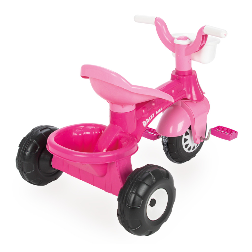 Tuto roztomilou tříkolku zdobí růžová barva s motivem kopretiny („Daisy“), která jí dodává přitažlivý dětský vzhled.Konstrukce tříkolky je lehká a zároveň pevná. Má tři robustní kola (pneumatiky jsou masivní/plastové), která zajišťují stabilní pohyb a snadné ovládání.Tříkolka nabízí praktické úložné řešení – velký košík na přední straně i další úložný prostor vzadu, kam si dítě může vložit své oblíbené hračky.Doporučený věk dítěte je od přibližně 3 let (děti od 36 měsíců). Maximální hmotnost je až 35 kg.