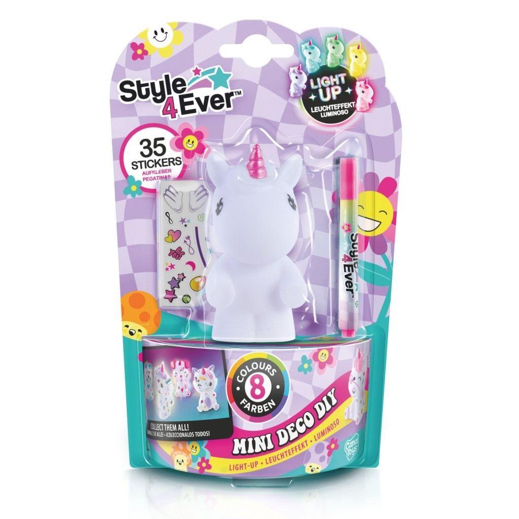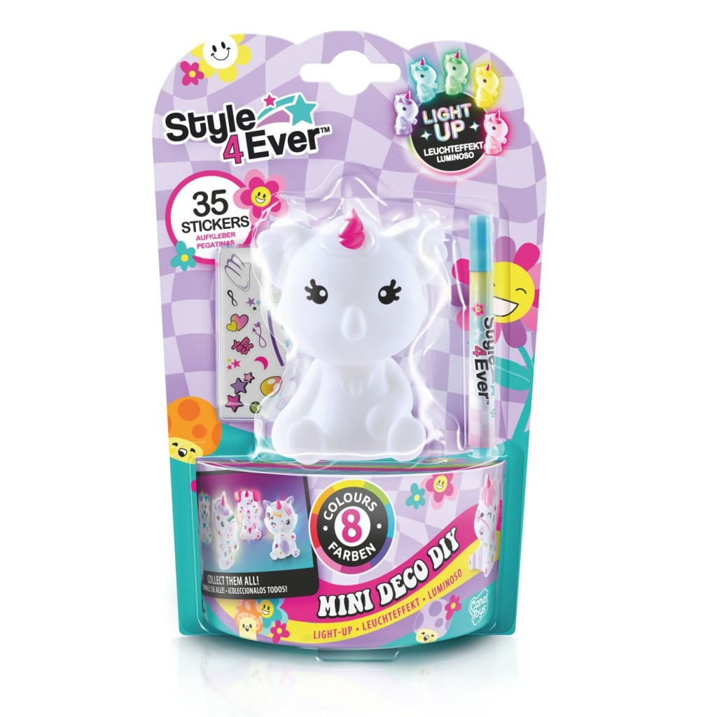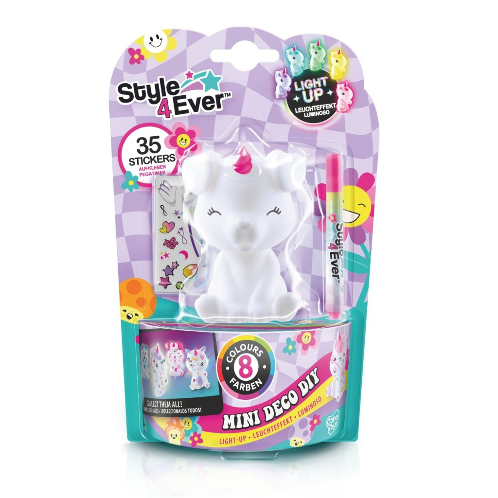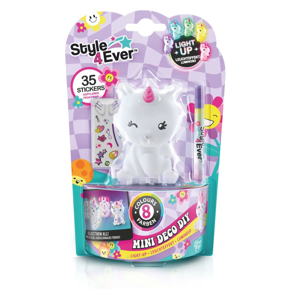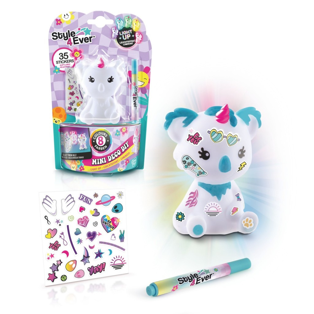 Oživte svůj prostor s touto jedinečnou svítící figurkou Style4Ever, která nabízí nejen krásné jemné světlo, ale také spoustu možností pro vlastní kreativitu! Na výběr je 6 různých assortů – 2 typy jednorožců, koala, pes a kočka. V každém balení naleznete samolepky a fix pro dozdobení figurky podle vašeho vlastního stylu. Vytvořte si tak jedinečný kousek, který bude dokonale ladit s vaším interiérem. Figurka svítí 8 barvami. Jsou potřeba baterie 3× LR54 (jsou součástí balení). Doporučeno pro děti od 6ti let.