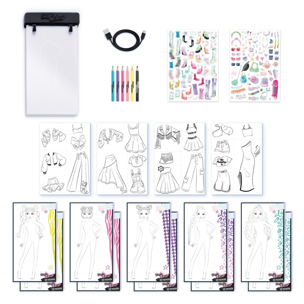 Novinka Style4Ever Návrhářská sada s podsvícenou podložkou vám přinese hodiny tvořivé zábavy. Splňte si sen a vytvořte návrhy jako módní návrhář. V sadě je k dispozici podložka s podsvícením, šablony, 10 modelů, 2 archy nálepek a barevné tužky pro vytvoření jedinečných módních návrhů. Balení obsahuje USB-C kabel pro nadné nabíjení. Vhodné pro děti od 6ti let.