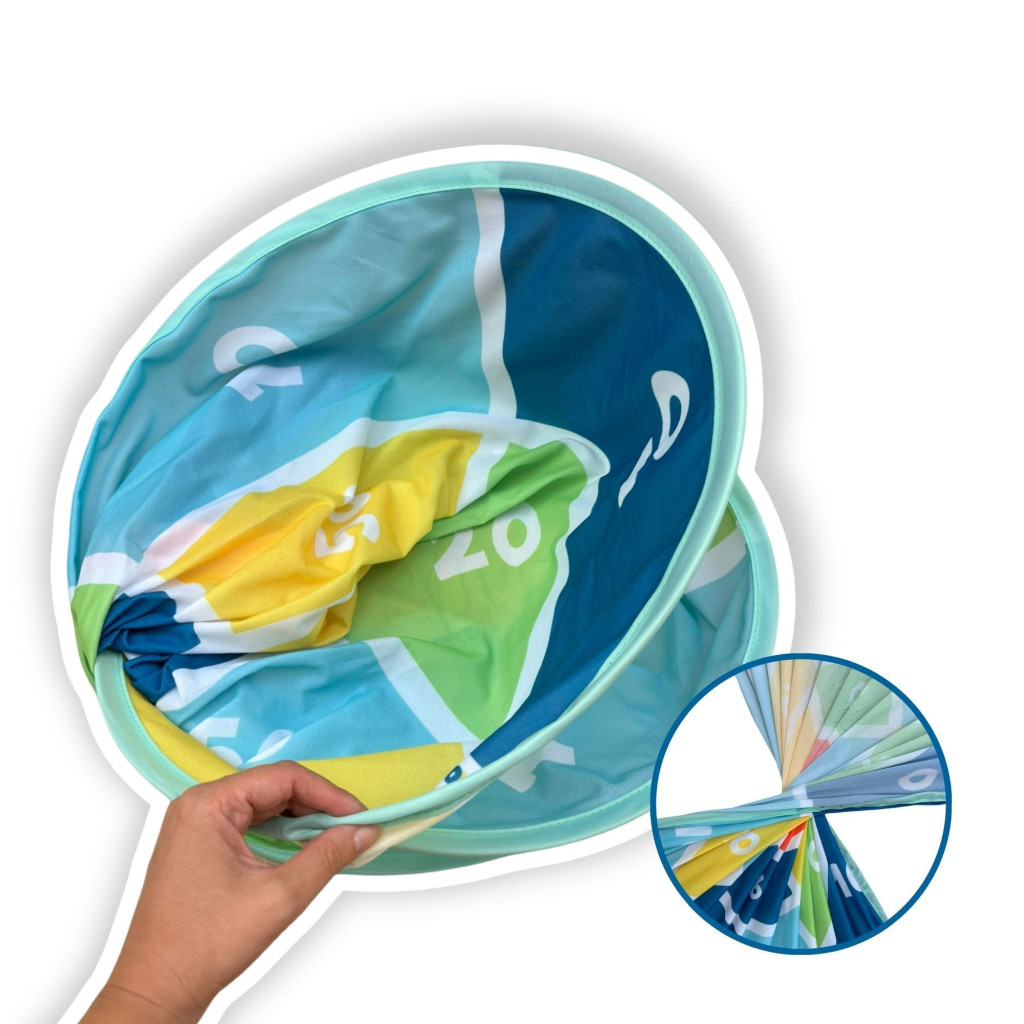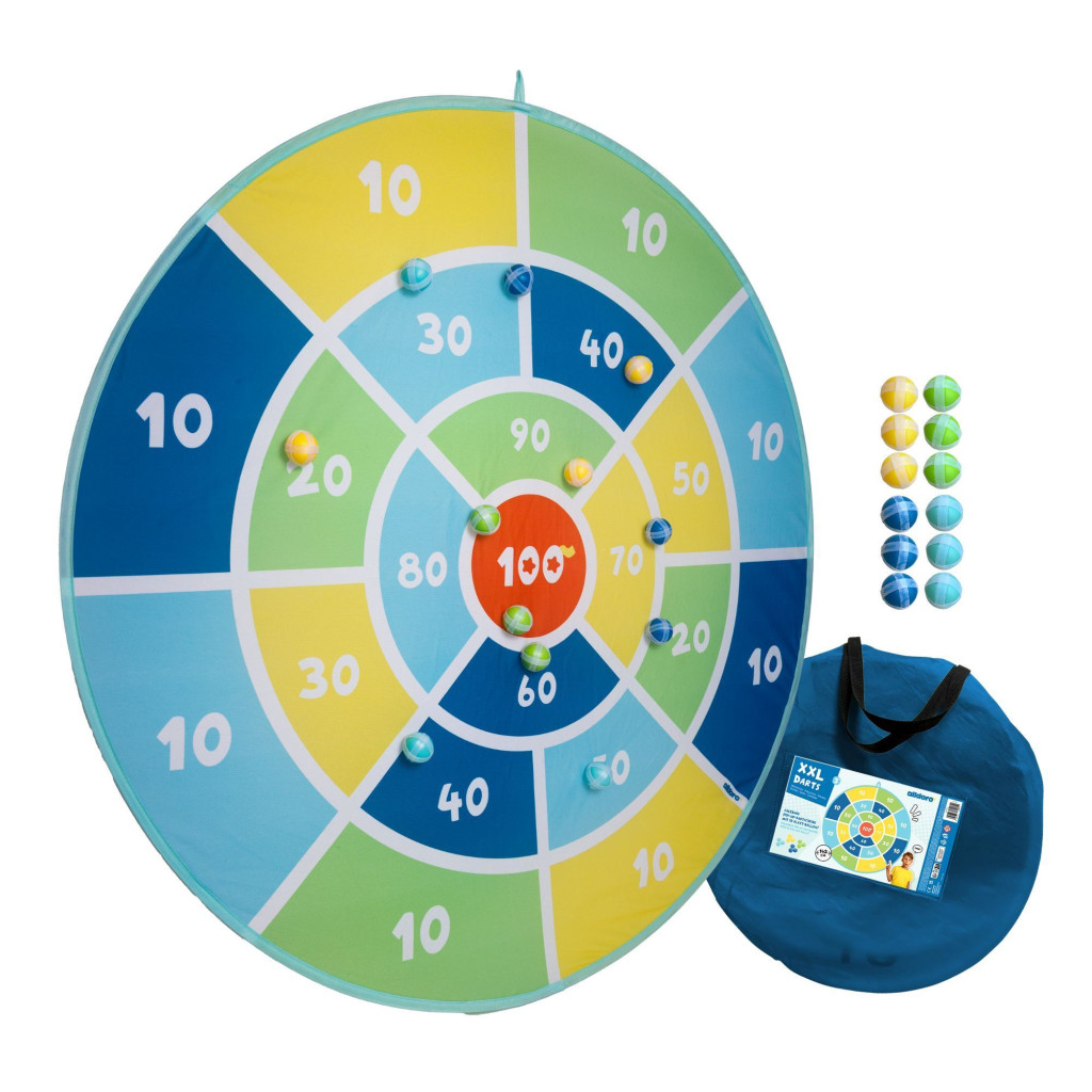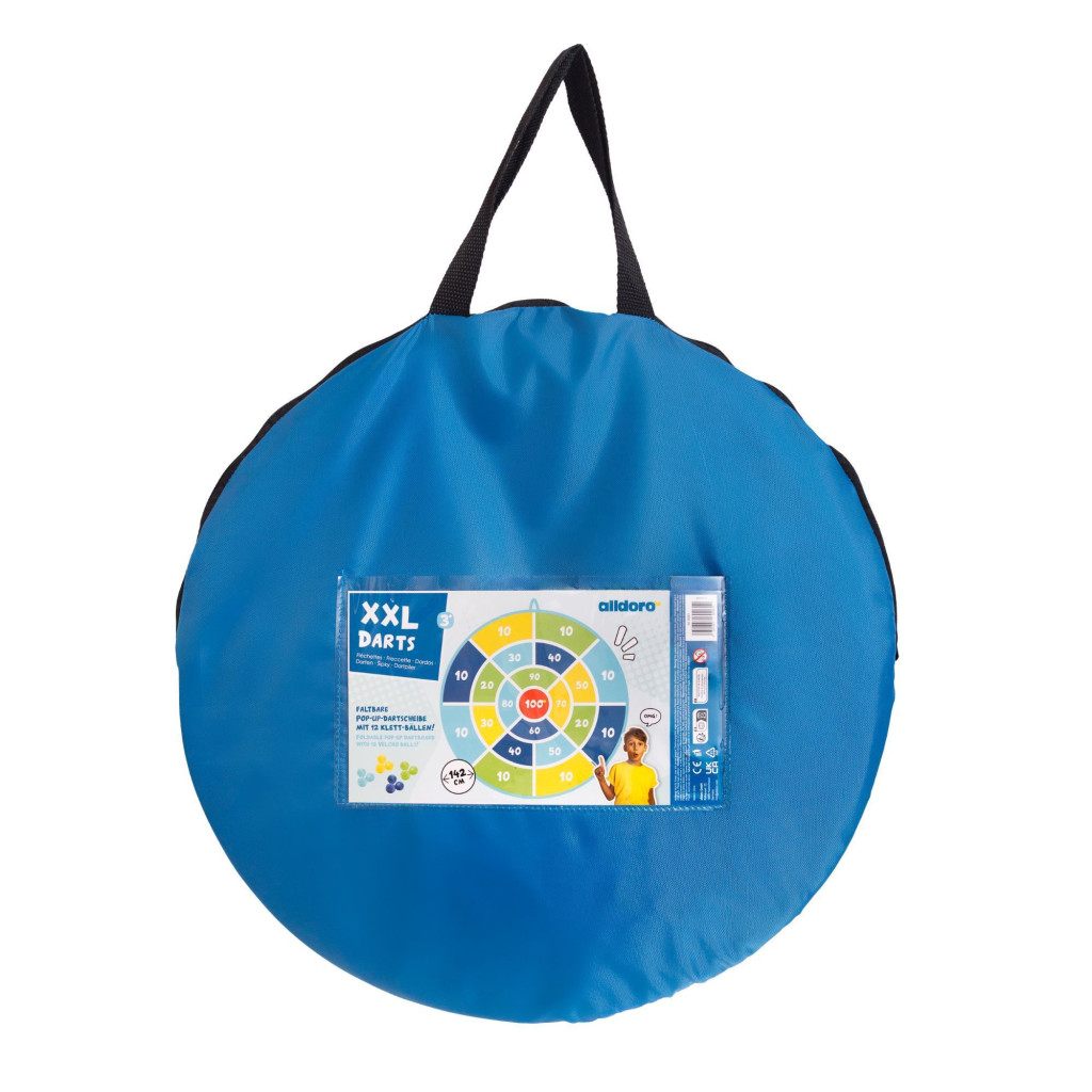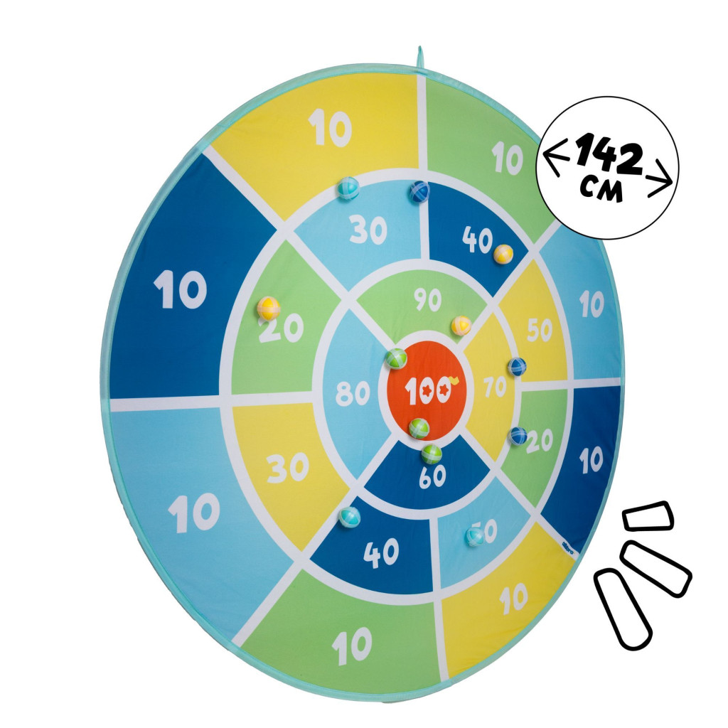 Obří skládací terč o průměru 142 cm a 12 míčků na suchý zip (každý o průměru 5 cm) s poutkem na zavěšení.