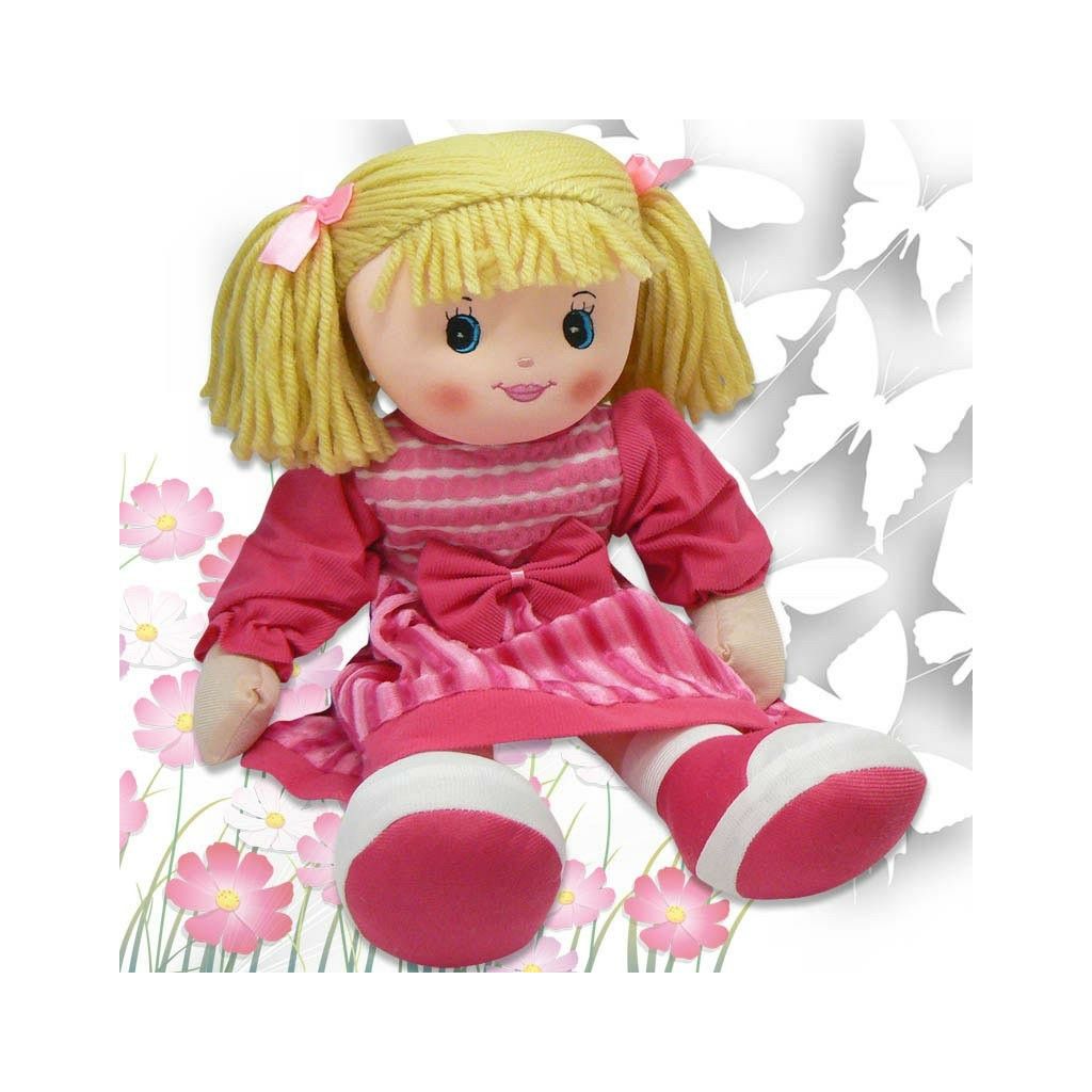 Hadrová panenka vhodná do postýlky, na cesty zkrátka kamkoli. Panenka má krásné dva culíčky na stranách hlavy. Oblečená je v růžových šatech.